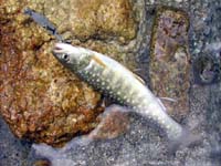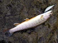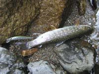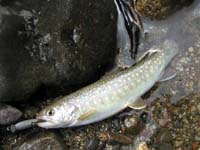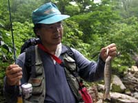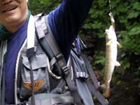 待ちくたびれた私は待ち合わせ場所のすぐ下を流れる渓でも竿を出してみましたが、写真上の様な小さな小さなイワナとヤマメがお相手をしてくれただけで、道路脇の人の多い渓流ではとてもじゃありませんが、大物を望める筈もありません。しかし夏の渓は透明度が高く、釣果とは全く関係なく清々しい遡行を楽しめます。ほんの1時間ほどの遡行でしたが、今年初めての流水域の釣りは、堰堤やダム湖とはまた違ったなんとも言えない魅力を思い出させてくれます。