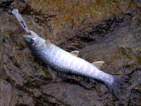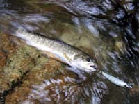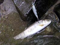 例によって渓遊会のメンバーはせっかちです。いつも通りに金曜の夜から現地入りし、土曜の早朝には一番に渓に入らないと気のすまない我が会長さんは、これまたいつも通りに、一人私を置き去りにして、とある源流に先に入ってしまっていました。メンバーは会長・佐谷名人・S長老の3人ですが、私には土曜夕方に某所に来るようにメイルで指示があっただけ。いわきで夜遅くまで仕事の終わらない私は、いつもの様に土曜はたった一人で近くの堰堤を釣るしかありません。でもま、釣果なら負けません。写真上のこの時期にしてはまずまずの33cm・31cmを釣り上げ、待ち合わせの場所へと向かいます。