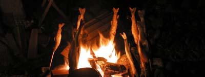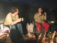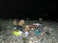 そして夜はいつもの様に焚き火を囲んでの宴会です。場所は写真上の超有名なキャンプ場なのですが、なぜか我々は芝生のキャンプサイトには入らず、すぐ横の石ころだらけの河原に陣を広げました。キャンプサイトにいた大勢に人たちは、恐らく我々を奇異の目で見てたのでしょうね。「よりによってあんな場所で・・・・」。そして、渓遊会の規則に則り、1人2尾の釣果をありがたくご馳走になりました。今年初めての宴会ですので、話題も尽きず、珍しく遅くまで呑み明かしてしまいました。