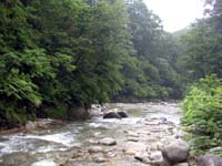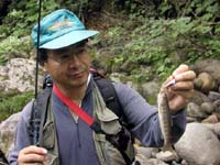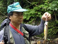 翌朝の3人には、早朝から渓を攻める元気はもうありません。中でも佐谷名人は前日の山越えですっかり体力を使い果たし、しかも骨酒を呑み過ぎてゲロを吐く始末で、この日は一人リタイヤ。今度は会長とS長老・私の3人で近くの源流へと向かいます。起きた時間はもう8時を回っていて、仕度をして河原に立ったのは9時半過ぎでしたが、昨今の釣りブームの低迷は相当なもので、こんな時間にも関わらずまだ誰も入渓していない状態の様でした。2つの沢の合流点から入渓すると、すぐに写真下の小さなイワナが元気に飛び出して来てくれました。