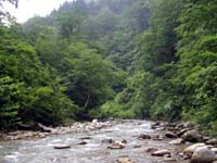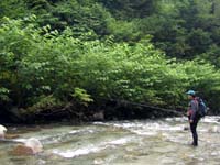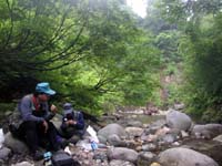 しかし、待ち合わせの場所へ着いても今回はメンバーがなかなか戻ってきません。通常の源流行ならば3時すぎにはキャンプサイトに戻って来るはずなのですが、今回は6時を過ぎるまで頑張っていたようです。なんでも、ひとつ山を越えて隣の渓の最源流部へと入ったのはいいが、工程が予想以上にきつく、時間が掛かってしまったとのこと。しかも最源流部は今年まだ殆ど人が入っておらず、尺上のイワナたちの楽園が残っていたとのこと。ついつい時間を忘れて釣っていた様でした。・・・ったく、うらやましいじゃねぇかい。