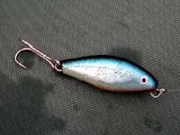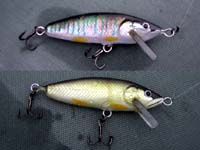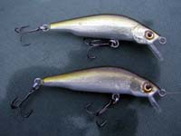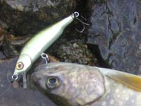 5.光ミノー50S(2005) このミノーは扁平で卵型をした実にユニークな形状を持っています。初めて見た時は「釣れるのかな?」と思ったものですが、実際に渓流域で使ってみると、20cmほどの小さなイワナ・ヤマメまで難なく誘い出してくれました。トゥィッチにはあまり反応せずやや直線的な動きでしたが、平たくてよく目立つためか、止めた時のヒラを打つ瞬間に魚が良く反応していました。スローシンキングタイプに属すると思われましたが、堰堤プールでは一度沈めてしまうと浮き上がってくることがあまり無く、底をゆっくりとトレースすることができ、プールの深みでも問題なく釣果を得られました。やや大きめで全体の重量があり、飛距離も十分です。試釣では、渓流域・堰堤プールともに、良い釣果を出してくれました。