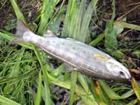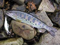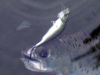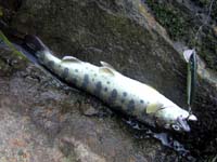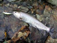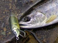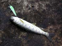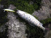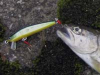2.takiミノー このミノーは非常に強い流れの中でもきびきびとした良い動きを見せてくれ、渓流域では殆どの場面でなんら問題なく対応してくれそうです。実際、渓流域の試釣では淵・瀬ともになんの苦労もなくヤマメを引きずり出してくれました。スローシンキングタイプになっていて、中層を実に小気味良く泳いでくれ、強い流れの中でも飛び出すことなくトゥィッチに耐えてくれます。ただ、堰堤プールでの釣りでは、今回は残念ながら釣果を得られませんでした。これは軽いために飛距離が稼げず、近づき過ぎなければならなかったことと、スローシンキングのために深いプールの底をトレースできなかったことが原因の様です。もっともこのミノーは最初から渓流域での釣りに合わせた設計となっている様であり、堰堤での試釣には無理があった様です。逆に非常に強い流れの本流や支流では、これまでも良い結果を出していますし、素晴らしい味方となりそうです。