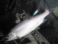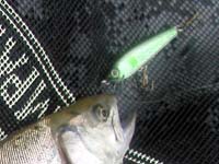 1.taki_kplusミノー 残念ながら非常に重いこのtaki_kplusミノーだけは、渓流域での試釣は行いませんでした。もともとこのミノーは止水の深いところでの使用を前提に作られていて、渓流で釣果を上げるには無理があるからです。一方で、堰堤プールでは他のどのミノーよりも遠投がきき、なおかつ底付近をリズミカルに素早くトレースできるため、大型のヤマメを狙うにはうってつけでした。ただ、リップが無いため棒引きでは反応がありませんでしたが、ジグの様にロッドワークで小刻みな動きを与えることで、普通にヤマメが喰い付いてきました。なお、スレではありますが、33cmの立派なヤマメをも掛けてしまったのは、底を素早くトレースできたことが要因ではなかったかと思われます。深くて透明度の高い堰堤やダム湖では、こういった重くて素早く沈むミノーは頼りになりそうです。