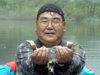当ホームページをご覧頂いている方の中には、少なからずハンドメイドミノービルダーがおられます。そんなビルダーの皆さんから、時折ではありますが、彼らの作品を試してみて欲しいと言うメイルが舞い込んできます。この5年間で頂いたミノーは5種類10個。7月の後半に、Buuさん・風玉さんとミニオフを行う傍ら、これらのミノーを堰堤プールと渓流の2つの釣り場で、試釣してみました。いずれの作品もそれぞれの作者の設計思想と思い入れが良く込められていて、小気味良い釣り味を楽しませてくれました。 ![]() 最初にミノーを贈って頂いたのは、今ではこの世界ではすっかり有名な「taki」さん(Taki's Handmade Lure)でした。2000年のことでしたが、当時、当サイトの掲示板にtakiさんが時折投稿されていて、何気なく私のかいた返信を見て、わざわざ私の希望のミノーを作って頂いたのです。そのミノーは写真下左のtaki_kplusミノーで、沈降速度毎秒1mという非常に重い堰堤プール用の特殊なミノーです。流石に超重量級のため、渓流で一度使った事があるのですが、わずか数投でロストしてしまったのを覚えています。ミノーは2個頂いたのですが、残り1個は大事にだいじに私のルアーBoxの中に保存してありました。