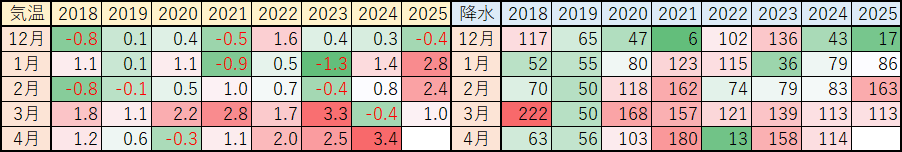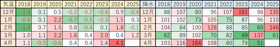 今年も渓流釣りのシーズンがやってきました。東北の今冬は数年ぶりの豪雪となり、昨年の様に雪代不足から早々にダム湖の釣りシーズンが終わってしまう様な事は無さそうです。ただ、5月以降の3ヵ月予報では、今年も高温が続くとの予報が出ていて、雪解けは相当に早く進みそうです。既に渓流釣りのシーズンは開幕していますが、今年は私的な所用がとても多く、未だに出漁ができていません。そのため、例年この時期に発表している気温や積雪のデータの解析結果のみを、まずはお届けする事にしました。本レポートには、釣行記はありません。 ![]() ![]() 【2025年シーズン未だ開幕せず】 今年も5月末頃までは新潟下越へ、以後11月初頃までは北海道へと、キャンピングカーを利用した長期の遠征釣行を予定しています。しかしながら、今年は所用がとても多く、いまだ東京で悶々としています。ただ幸いにも、今冬は降雪が非常に多く、多くのダム湖へは、道路の残雪で未だに車では入れない様です。今年の3・4月は天候が不安定で、桜の開花も早かった割には終了が例年より遅くなるという、変な年でした。 なお、筆者は今年6月に74歳となり、頻繁なWebサイトの更新作業が体力的・精神的にますます厳しくなっています。昨年はなんとか例年並みにレポートをお届けし続けることができましたが、そろそろ限界の様です。レポート頻度が急に大幅に低下する可能性がありますが、ご理解をお願い致します。