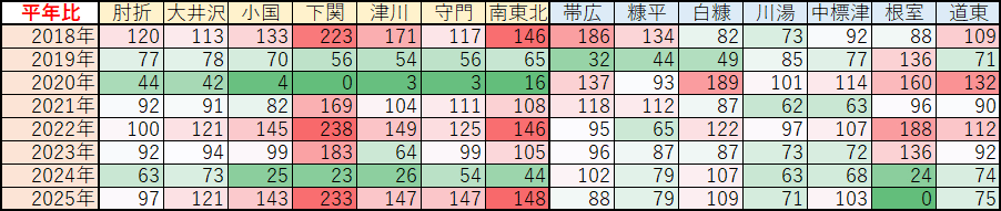 一方で、北海道では昨年に続き、残雪のほとんどない春となっている様です。道東では1〜2月に高温が続き、十勝では記録的な豪雪が見られたにも関わらず、急速に雪解けが進んだ様です。北海道では近海の海水温の非常に高い状態が長く続いていて、本州以上に温暖化の影響を受けている様です。今夏も北の地は酷暑に悩まされそうです。(下表は南東北と道東の3月の最深積雪(概ね3月初の残雪量に等しい)を示しています) 南東北・道東の各地点の3月の最深積雪の平年比(%)- 赤いほど例年より残雪が多かった事を示す
