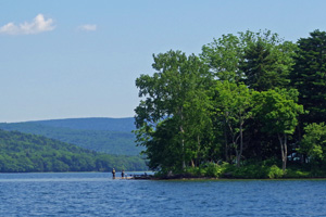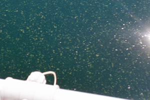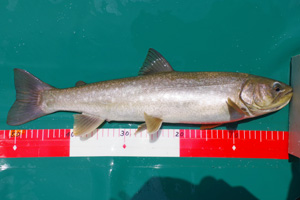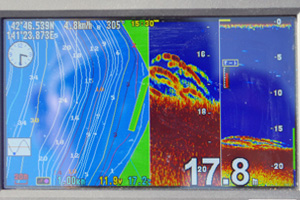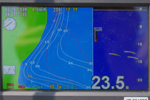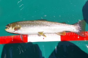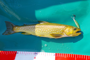 そして、のんびりと10時ころから二人でレイクトローリングを開始しましたが、驚いた事に水温は19℃を超えていて、魚たちの泳層は水深10m付近と、既に真夏並み。仕方なく潜行板を持ち出して、水深10m付近を釣りましたが、これがまた釣れないのです。いつも通りにアメマスらしき魚影が魚探に多数映っているのですが、ほとんど反応がありません。それでも10時半過ぎに、Yさんのロッドに魚信が有り、なんとか金アメマス50cmは確保しました。他にジギングでも釣れましたが、16時まで粘ってYさんに50、40、37cm、私に39cmの4尾だけ。過去最低釣果でした。