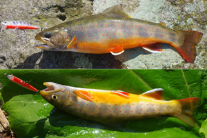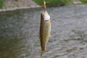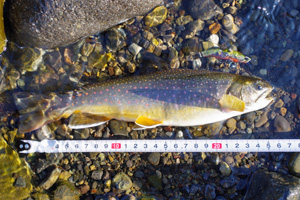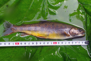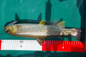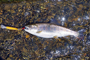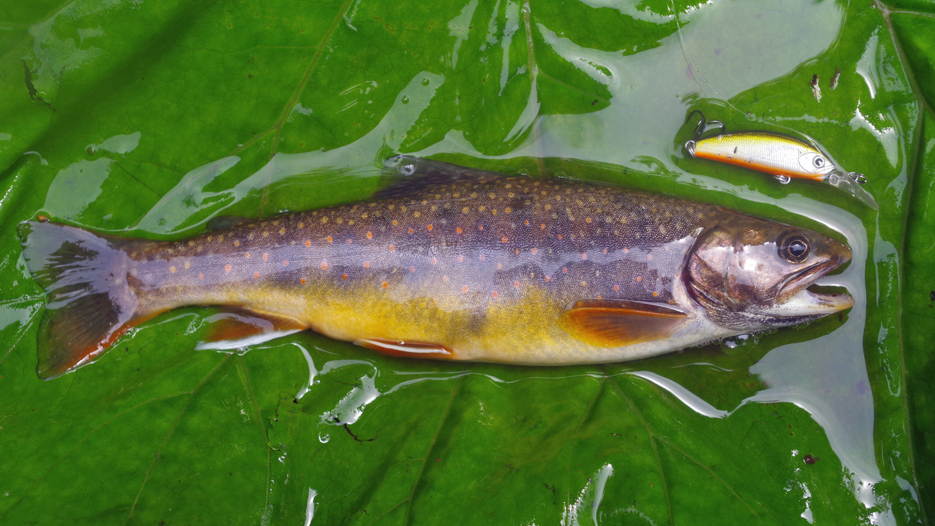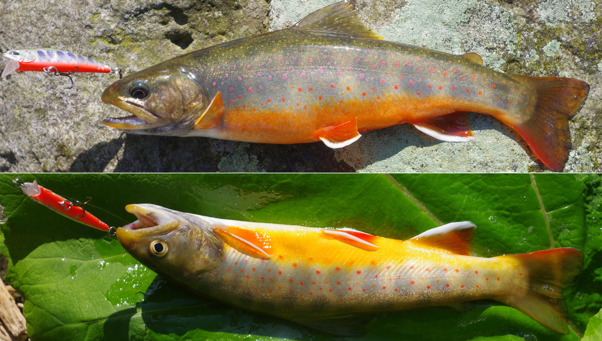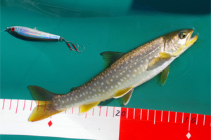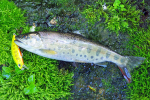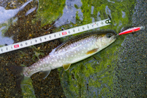 【使用タックル】 トローリング:TrollingRod110、StradicC3000、SiglonPEx8(35lb/2号)+Nanodax20lb、自作潜行板(大サイズ)、 Sukari60deep/Rグリーン、TrollingPepper100(SBL改)、D-Contact72S/鮎(SBL改) ジギング:CarddiffNX/S83ML、VanquishC3000、SiglonPEx8(35lb/2号)+Nanodax17.5lb、 C-Mission28/35g/ブルーピンク/チャート(SBL改) 【6月26日(木曜)猛暑の時は湧水河川に限る】 この日も朝からクソ暑く、別海地方は30℃超えの真夏日でした。阿寒湖は湖面上でまだ涼しかったのですが、この日は我慢できずに湧水の渓に逃げ込みました。ただ、皆さん同じ様な事を考えている様で、入渓した途端に3人のフライマンに出くわしてしまいました。聞くと東京の人達らしく、小イワナが数尾づつは釣れたらしい。私はルアー釣りですが、フライとルアーでは釣り方も狙うポイントも違うため、フライで釣った後でもルアーで問題無く釣れます。構わずにそのまま釣り下がると、いつもの小滝の前で4尾、滝つぼでも2尾のイワナと20cmちょっとのヤマメ君がお相手をしてくれました。
