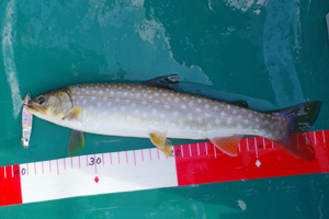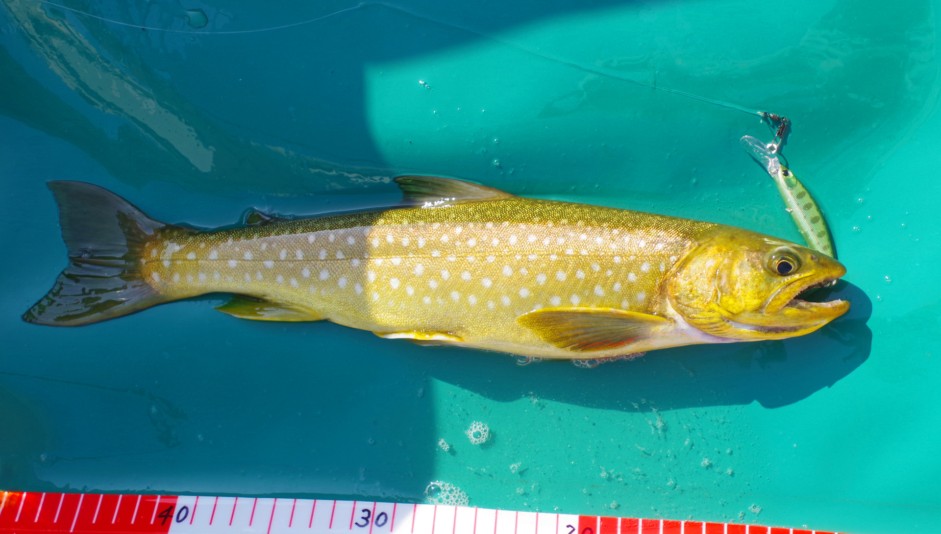 午後からはニジマス狙いでSukari60DeepやD-Contact72に切り替え、沖合の深い場所での5km/h程度の高速トローリングに切り替えました。過去の経験から、沖合の高速トローリングでは、数は少ないですが、ニジマスの他に大型のアメマスが稀に釣れる事が判っています。1時間以上も無反応を我慢し続け、14時半近くになって釣れて来たのは、下写真の丸々と太った強烈な馬力の金アメマス57cmでした。他にジギングでも55cmが釣れてくれ、アメマスばかりでしたが、57,55,52,48,44,43,42,39,38,36cmの計10尾と、まずまずの釣果でした。阿寒湖は今年も健在の様でした。