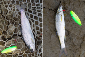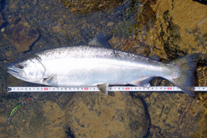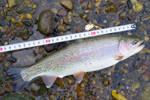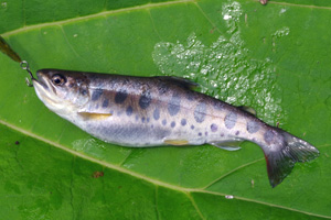 もっとも、殆どが上右写真の様な、超おチビちゃんばかり。1尾だけ40cmクラスがヒットしてきたものの、大暴れされた挙句にあっさりとバレてしまいました。やはりトリプルフックは良くバレます。結局、最大は尺ちょっとまででしたが、2時間ほどで10尾ほどの釣果があり、半年ぶりの十勝の渓を満喫できました。そういえば、昨年はこの辺りで同時期に小さなヤマメが山の様に釣れたものですが、今年はさっぱり釣れませんでした。今年は遡上サクラマスも少ないのかも知れませんね。大きいサクラは邪魔なだけですので、来てほしくありませんね。