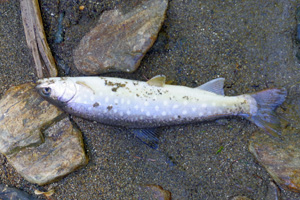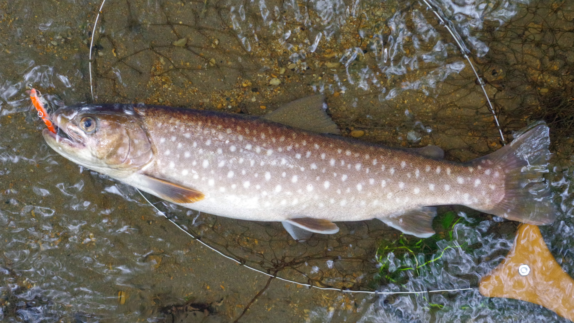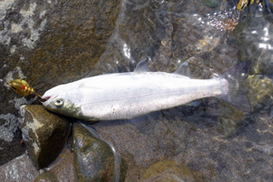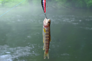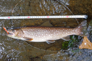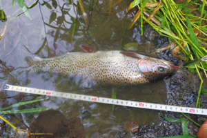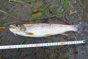 20mほど上流からミノーを投げ込み、ラインを出して倒木の下に送り込みます。少しだけミノーを踊らせ誘うと、想定通りに強烈な魚信が出て、魚が大暴れし始めました。良型ニジマス!と喜んだのですが、しかし、寄せてくると意外にも小さく、35cmのニジマス君でした。その後は少し上流側の釣り場へ移動し、やはり上流側からミノーをポイントに送り込む作戦を続けていると、今度は更に強烈な魚信が出て、大ニジマスか!と再度大喜び。しかし、今度は斑点の青みがかった42cmのイワナ君でした。ぬか喜びも2回続くとゲンナリですね。でもま、この渓で40cm超えのイワナは数年ぶりであり、満足して竿を収めました。