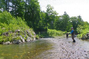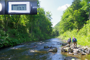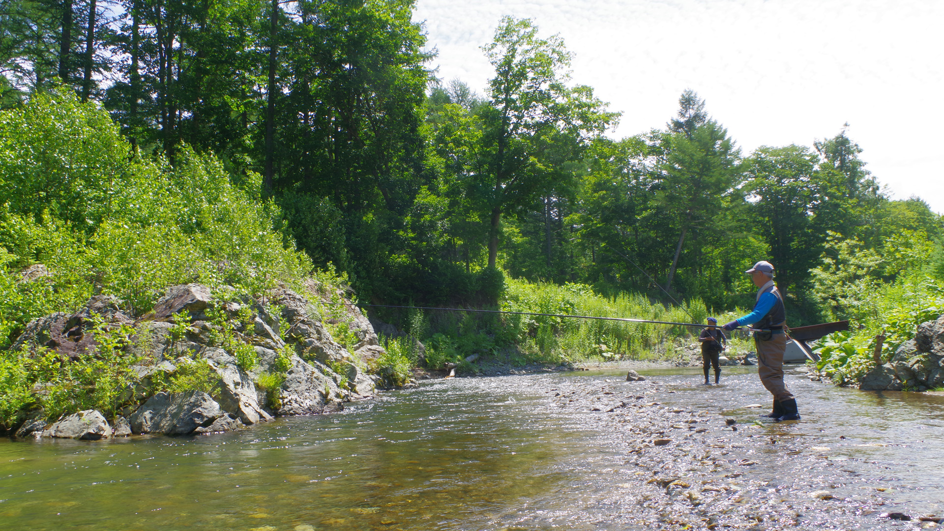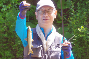 7月も中旬になり、北海道は相変わらずの暑い日が続いています。渓水温は遥かに20℃を超え、通常の渓流釣りはほぼ不可能な状態ですが、それでも、レイクトローリングや湧水の渓・源流の釣りなどでお茶を濁しながら、楽しんでいます。この週は宇都宮の朝日氏に加え、山形から佐谷氏も合流し、山形渓遊会の3名で釣りとキャンプを楽しみました。北海道も猛暑は8月初ころまで治まりそうに無く、あと1ヵ月ほどをどの様に過ごすかが悩ましい所です。 (下写真は、上川地方の源流のイワナ釣り場) ![]() ![]() 【7月11日(金)山形渓遊会3名でBBQを楽しむ】 この日は山形から渓遊会の佐谷氏が来道しましたが、我々と合流するまでに時間があったため、午前中の短い時間でしたが、2日前の大ニジマスの大バラシのリベンジに向かいました。ただ、2日前と比べると気温が5℃ほども低下しており、ダム湖畔はやや肌寒い状況で、どうも活性が上がりそうもありません。それでもダムのインレットで何種類かのルアーを投げていると、コツンと小さな魚信が2回ほどあり、食い気のある小物がいると判断。スピナーに取り変えると、案の定、下写真の小さな銀化したニジマスがヒット。結局、釣果はこの1尾だけでした。