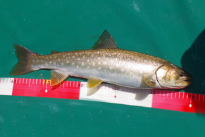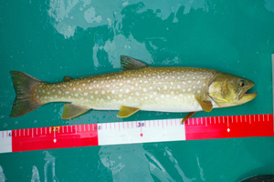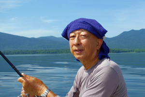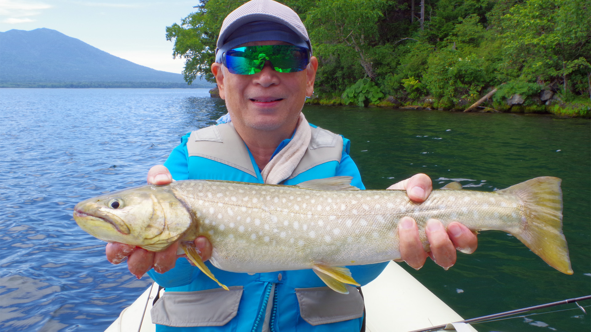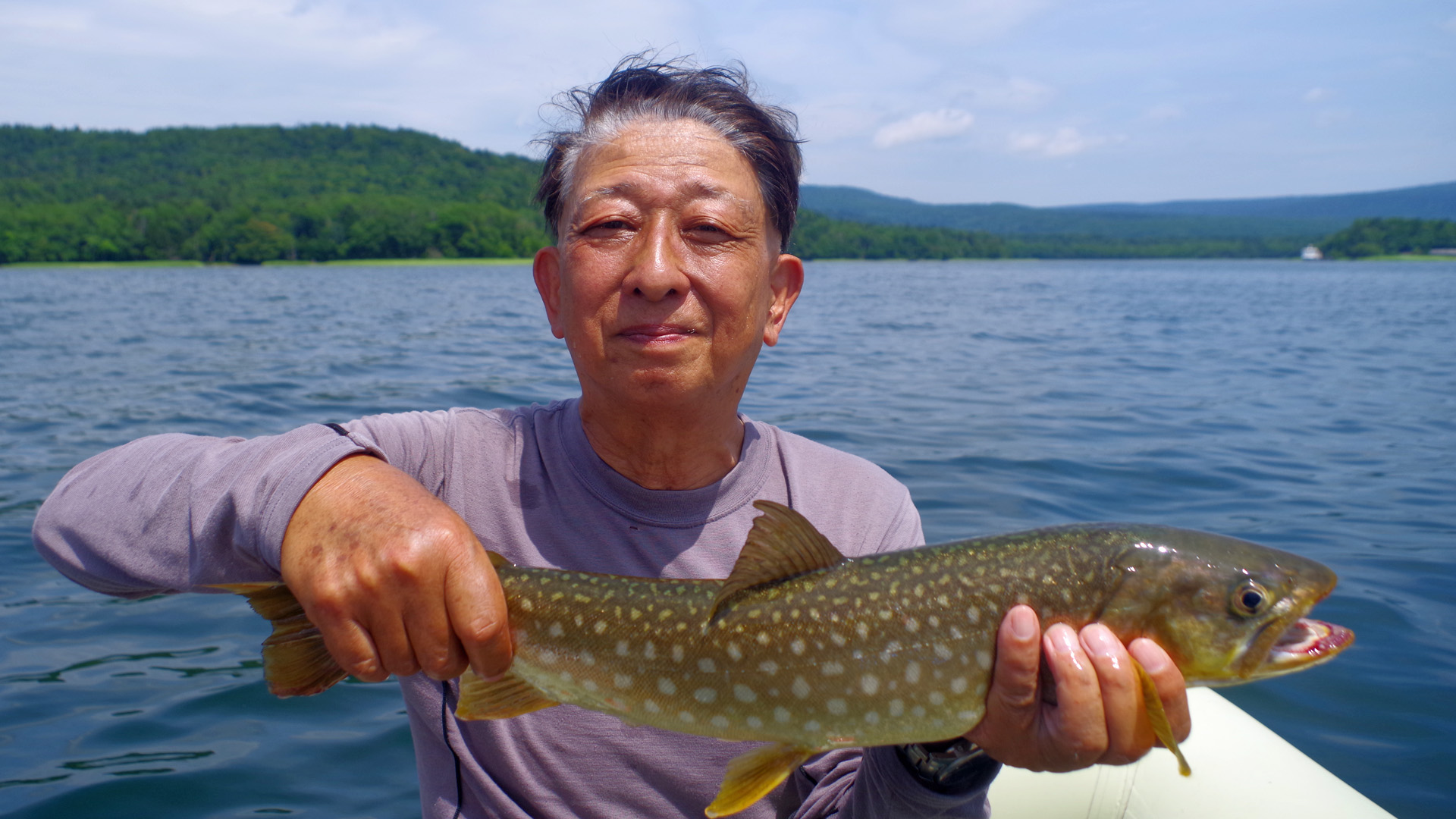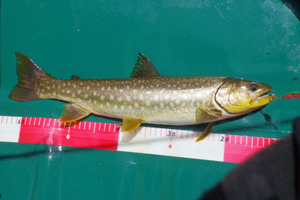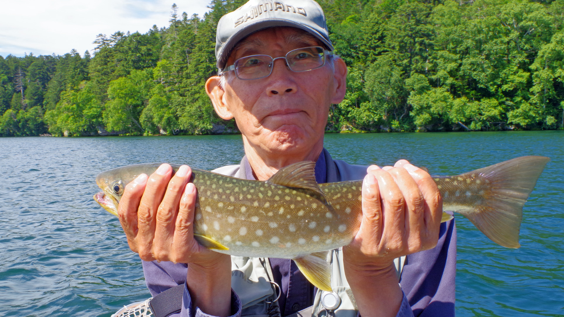 【使用タックル】 ありません。 【7月13日(日)山形渓遊会:佐谷氏と阿寒湖でレイトロ】 この日は渓遊会の佐谷氏の希望で、阿寒湖でレイクトローリングを楽しみました。ボートには事実上2人しか乗れないため、朝日氏は付近の山の散策に出かけた様です。8時半頃に出艇しましたが、午前中はほぼ無風状態の絶好のトローリング日和でした。主に佐谷氏に釣って貰うため、私は操船と写真斑に徹していました。ボートを漕ぎだすと、すぐに小型のアメマスがヒットし始め、どうやら活性は高い様です。表層水温は22℃前後で、魚たちの泳層は水深10〜15m付近で、潜行板のトローリングには打って付けの状況でした。