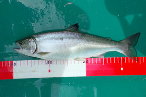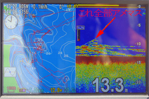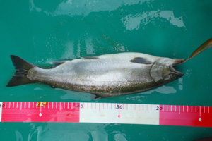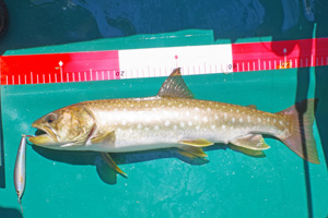 本当はニジマスが釣りたいのですが、薄曇りの肌寒いこういった日は期待薄なため、低速走行でアメマス中心に最後まで釣り続けました。ただそれでも、11時頃には佐谷氏のロッドに小気味よい魚信が出て、サクラマス35cmがヒット。昨年は大型のサクラが良く釣れていましたが、今年は数も少なく小さい様です。他はアメマスばかりで、結局、佐谷氏には58、54、51cm、40cm台2尾、40cm未満7尾、サクラ35cm1尾の計13尾。私も午後14時ころから一緒に釣り始めましたが、釣果は56cmとジギング38cmの2尾だけでした。15時ころには風が強くなり、白波が立ち始めたため、早めの撤収となりました。
