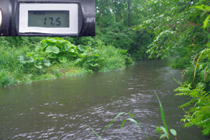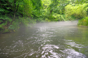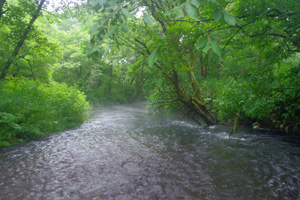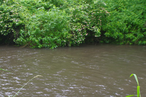 【使用タックル】 佐谷氏:PalmsLakezeeLSZS-991/SS、StradicC3000、SiglonPEx8(35lb/2号)+Nanodax20lb、自作潜行板中サイズ、 TrollingPepper100(SBL改)、他 K++:CarddiffNX/S83ML、VanquishC3000、SiglonPEx8(35lb/2号)+Nanodax17.5lb、自作潜行板中サイズ、TrollingPepper100(SBL改)、他 【7月15日(火)台風通過で道東は濁流の中、湧水の渓へ】 14日夜は台風5号が北海道に上陸し、道東では夜半に30mm前後の降雨がありました。久しぶりの多めの降雨で、道東の殆どの河川が泥濁りの状況となりました。そのため、午前中は濁りの余り出ない別海地方の湧水の渓へと向かってみました。最初は中流域の最も大ニジマスの狙えそうなポイントに入渓してみましたが、これが予想外に濁りが強く、透明度は50cmもありません。それでも良く目立つスピナーでしつこく誘っていると、このポイントでは珍しい、尺ちょっとのアメマスがヒット。他にも小さなニジマスがヒットしましたが、大物の気配はありません。