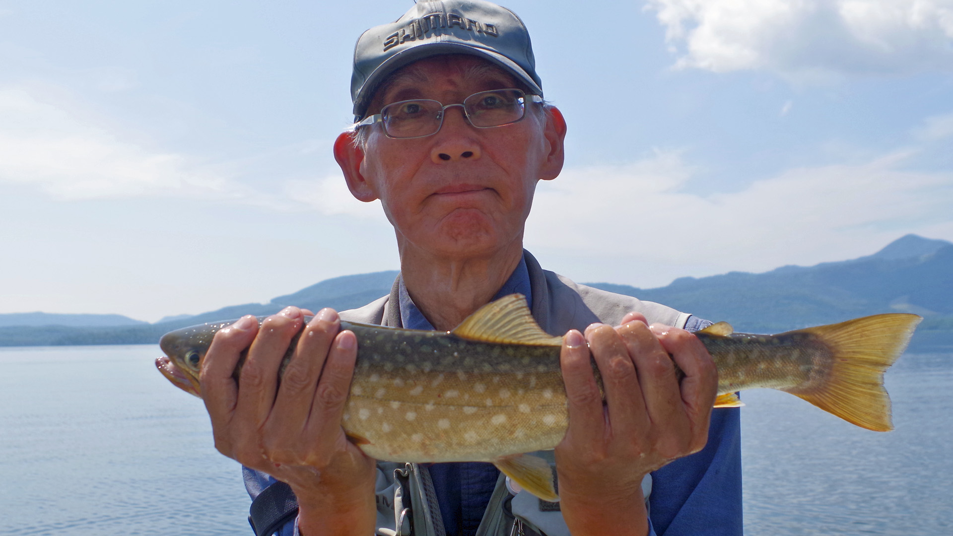 【使用タックル】 IL_Flusso/Tilf72、VanfordC3000HG、SiglonPEx8(35lb/2号)+GrandMaxFx2.5号、Bretton#2/金赤/銀赤、他 【7月17日(木)山形渓遊会:今度は朝日氏と阿寒湖でレイトロ】 4日前に渓遊会の佐谷氏と阿寒湖でレイクトローリングを行いましたが、再び風波の弱い日が巡ってきたため、今度は朝日氏と同じ事をする事になりました。ボートには一度に2人しか乗れないため、こんな風に2回に分けて同じ事をしなければならないハメに。渓遊会の2人は全く、世話が焼けます。もともとは2人とも餌釣り師なのですが、一度レイトロを経験すると、そりゃもう大型のアメマス入れ食いで、病みつきになってしまった訳です。さて、この日は北海道でも記録的な高温を記録した日となり、斜里町では7月の最高気温を更新する猛暑となりました。