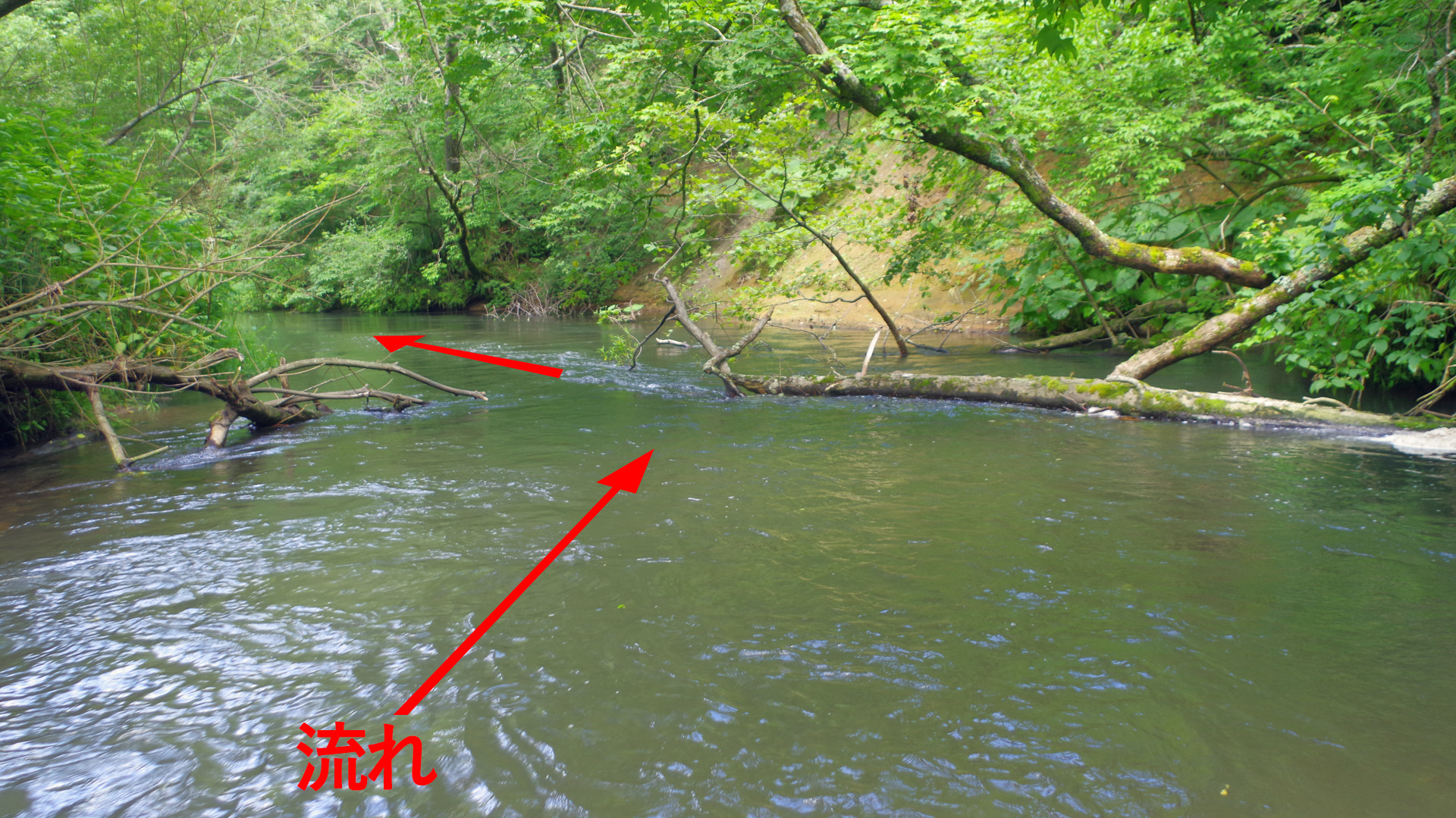 【使用タックル】 朝日氏:PalmsLakezeeLSZS-991/SS、StradicC3000、SiglonPEx8(35lb/2号)+Nanodax20lb、自作潜行板中サイズ、 TrollingPepper100(SBL改)、他 K++:CarddiffNX/S83ML、VanquishC3000、SiglonPEx8(35lb/2号)+Nanodax17.5lb、自作潜行板中サイズ、TrollingPepper100(SBL改)、他 【7月18日(金)クソ暑い日は湧水の渓に限ります】 前日で渓遊会のメンバーともお別れし、真夏日のこの日は別海の湧水の渓で涼みながら遊ぶ事にしました。ただ、湧水とは言え、この日は水温が19℃台といつもより高め。それでも、お昼ころから出漁すると活性は高く、すぐに小さなイワナがヒットしてきました。地元の皆さんは活性の高い状況が良くお判りの様で、すぐに下流から釣り人が上がってきます。しかも、橋の上からこちらの様子を伺う車も2台ほどありました。地元民の動向こそが時合いの判断基準になりますね。こりゃ期待できるかなと釣り続けていると、写真下中央の様な倒木の横たわるポイントに到達。