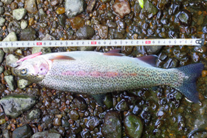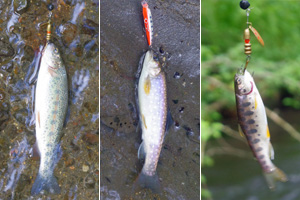 この川は湧水の渓のため、最源流部は湧き水のみでジンクリアですが、下流へ行くほどに支流が合流して濁りが強くなります。3kmほども上流へ移動すると、透明度は1mほどにまで上がり、ルアー釣りには丁度良い状況でした。ただ、水温が急降下したためか、或いはまだ濁りが強過ぎるのか、良く判りませんが、ルアーを投げども投げども、殆ど反応がありません。しつこくスピナーを投げていると、下写真の様な小さな小さなニジマスとヤマメが辛うじてヒット。途中でぐらつく底石に足を取られ、転んでしまって下半身が水浸しになってしまい、やむなく撤収しました。