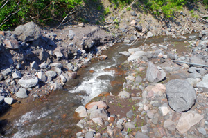 【使用タックル】 ありません。 【7月24日(木)利尻島には渓流釣りは存在しないのか?】 この日は北見市で39℃を記録し、道内18地点で観測記録最高を更新するという、とんでもない酷暑の日でした。ただ、利尻島は最高気温26℃前後と、多少は蒸し暑いものの、大したことはありません。最も暑いこの週を、宗谷で過ごすことに決めたのは、大正解の様です。さて、利尻2日目のこの日は、地元の釣り人にあれこれと状況を聞いて、渓流釣りのできる渓が有るのか探ってみました。結果は、利尻ではオショロコマのみが生息していて、それも最近では釣れる渓は1本だけらしい。昔は他の渓でも釣れていたらしいのですが、ほぼ絶滅状態の様です。ちなみに、利尻にはヒグマ、キタキツネ、ヘビはいないらしい。