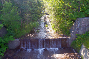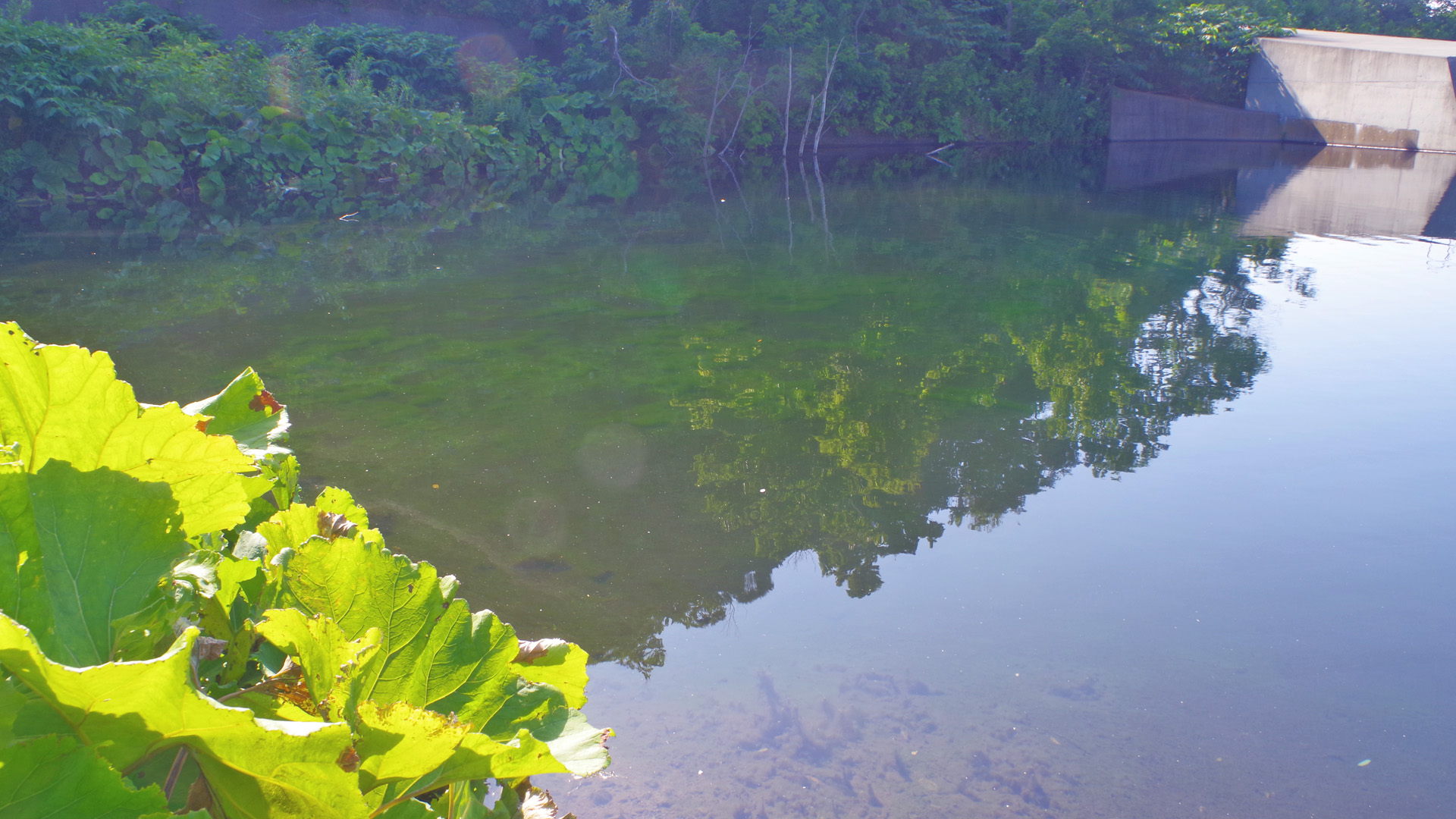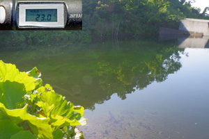 実際にこの島の最も規模の大きい渓を見に行ってみましたが、写真上左の様に、川幅が100m程もあるのに対し、水量は幅1mほどしかありません。どうやらこの所の酷暑で渇水が進んだ様で、これでは魚が生きては行けません。実は島内の殆どの河川は、写真上右の様に、極端な護岸工事で無残な姿を晒しています。そして、唯一オショロの釣れるらしい渓に行き、堰堤のプールで小さなミノーを投げてみましたが、水温が23℃もあり、お魚さんの反応は全くありませんでした。なんでも上流に行けば魚影が有るらしいのですが、猛暑とアブ地獄の中、渓を遡行する元気はありません。残念!