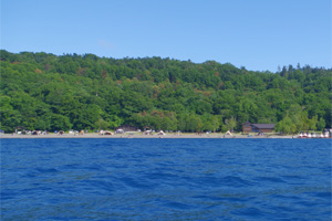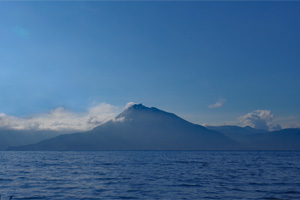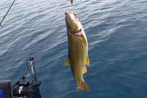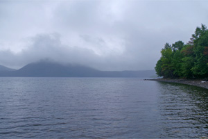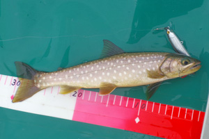 そして、最も釣れる可能性の高い午前の時間帯に期待して、翌31日は早朝7時前から出漁しました。ところが、天気予報が大きく外れ、朝からどんよりと暗く小雨の降る日でした。こういった急に天候の悪化した日は、たとえ真夏と言えど、レイクトローリングには厳しいのです。案の定、前日と比べると魚の反応は極めて乏しく、なんとか小アメマスは釣り上げたものの、ブラウントラウトはどこへやら。結局、5時間もルアーを流し続けたものの、釣果はアメマス1尾と、巨大なうぐい君が1尾だけ。支笏湖は修行の湖と呼ばれますが、正にこの日は修行そのものでした。