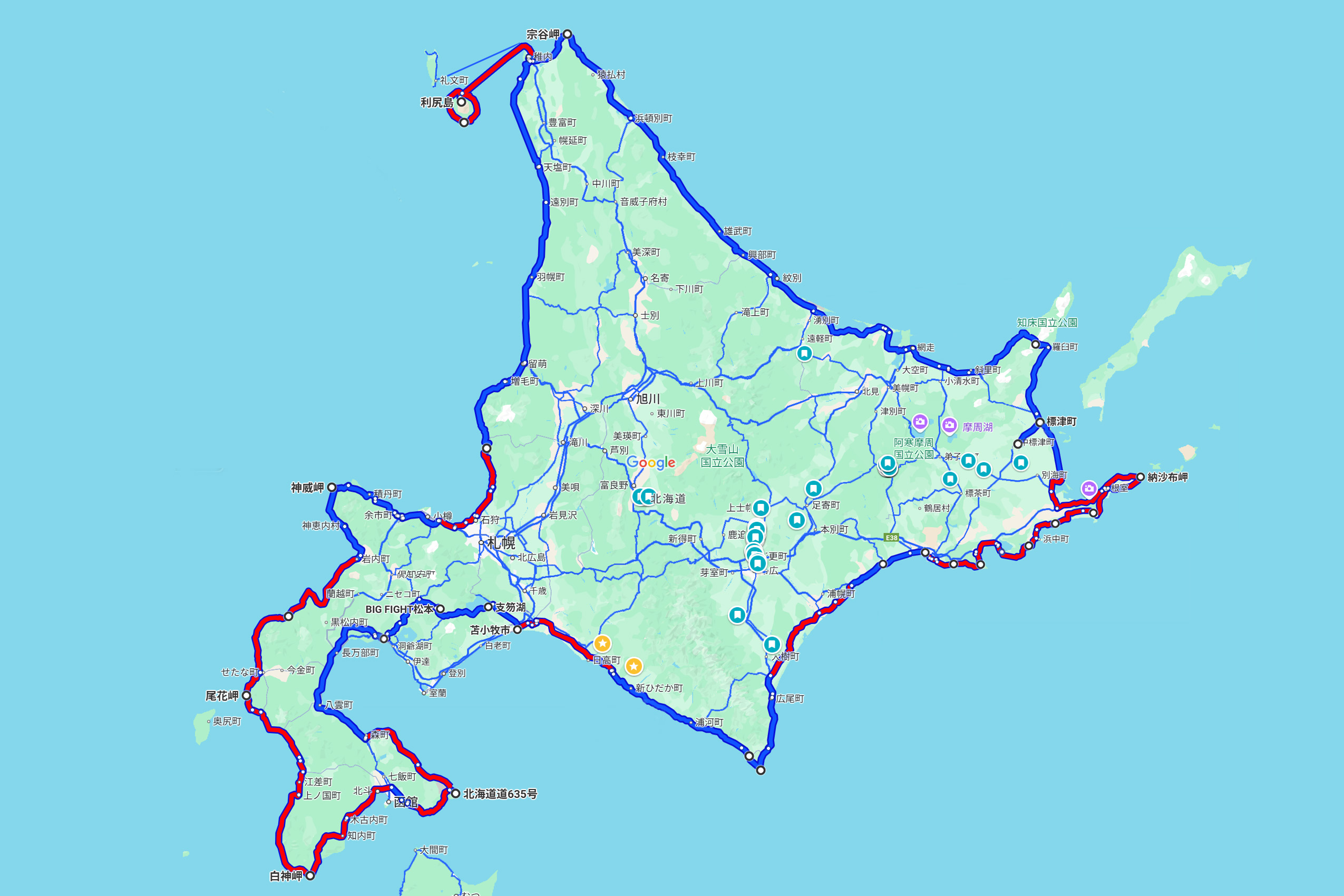 さて、7月21日に中標津を出発し、丸2週間を費やして北海道を一周してきました。今回は高速道路や高規格道路を一切使わず、ひたすら海岸線沿いの古い道路を選んで、約2500kmを走りました。下の地図に示した太い線は今回通過した道路であり、赤い線は今回、初めて通過した道路(これまで高速道路・国道を利用していた区間を含む)であり、20年も通っている北海道でも、まだまだ未知の場所が沢山ある事を思い知らされました。今年74歳になった私ですが、健康が続く限り、まだまだ北海道に通い続ける事になりそうです。北海道は本当に「でっかいどう」でした。