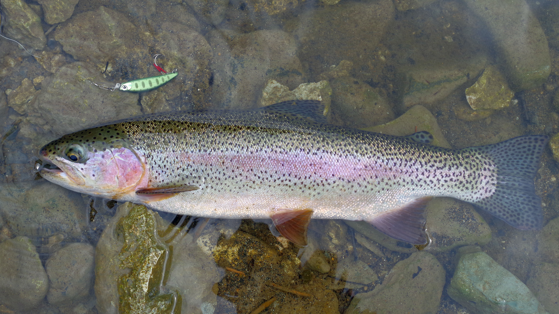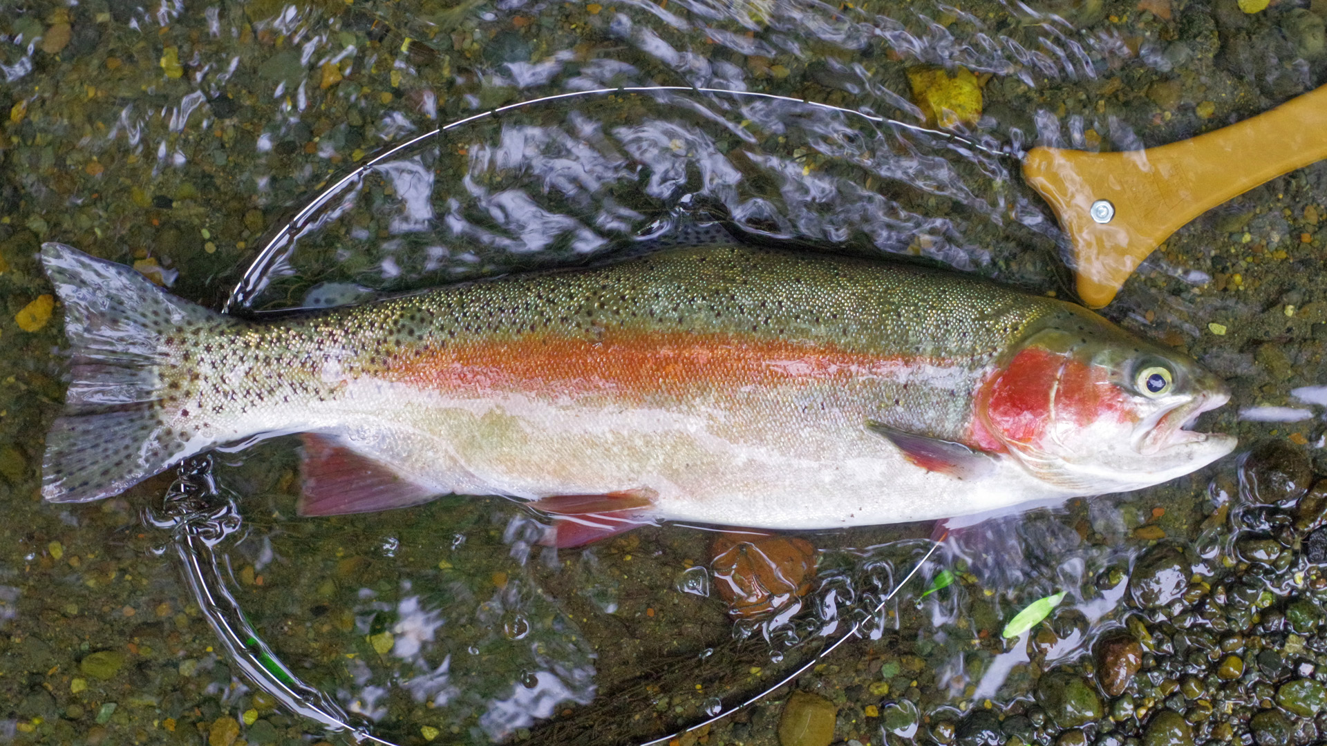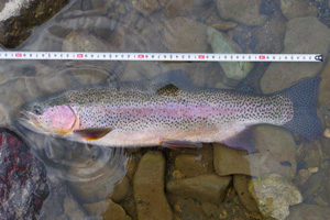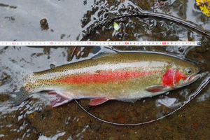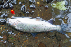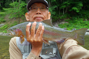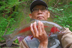 少し釣り下がると、2週間前に36cmを釣った倒木のポイントが見えてきました。流心にミノーを投げ込み、倒木に沿って倒木の下あたりを泳ぐ様にリーリング。すると一瞬、大きな魚がギラっと光るのが見え、次の瞬間、ガクンと強烈な魚信が出て魚が暴れ始めました。この渓はモタモタしていると脇の流木などに絡まれてアウトですので、大慌てで強引に手前の岸辺にずり上げました。今シーズンは、新潟のイワナも48cm止まり、支笏湖のブラウンも不発、ニジマスも41cmが1尾だけと、最悪の状況でしたが、ようやく釣れた大ニジマスに大々々満足でロッドを納めました。