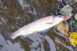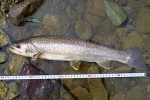 釣り人だらけの時の神頼みは、ダム上の渓に限ります。熊を恐れて、人が少ないのです。それでも現場に到着すると餌釣り師が2人、先行していました。ただ、短い竿の餌釣りでは手前しか釣っていないだろうと、構わずに良く飛ぶミノーで釣り始めました。すると想定通りに入れ食いモードに。1尾目にヒットしてきたのは、写真下の50cmジャストの大ニジマス。現場では泣き50cmに見えたのですが、写真は50cmに見えるので、50cmということにしておきます。アメマスも48cmまで7尾もヒット。その後は雨でたった3時間ほどでしたが、久々の爆釣を楽しめました。