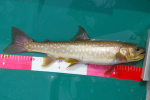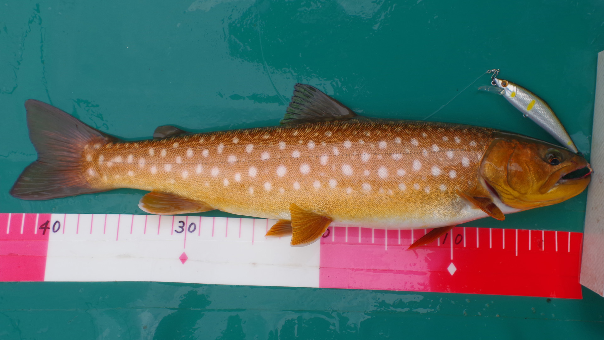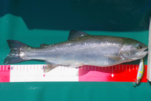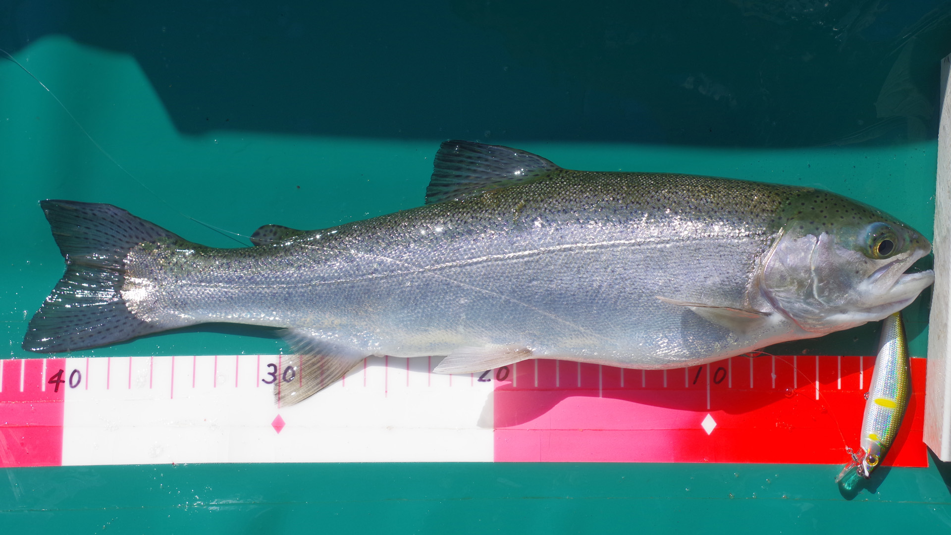 そして、この日は大ニジマスに的を絞り、良くウォブリングするD-Contactを使用。5km/hr以上の高速で、いつもよりずっと沖合だけでトローリングを続けました。遅い速度では、高速のニジマスにルアーを見切られるのではないか、と考えられるからです。この作戦はある程度は正解だったのか、釣り始めてすぐに42cmの元気なニジマスがヒット。こりゃイケるかなと思ったのですが、あとはアメマスばかり。ただ、ウグイ君はこの日、ゼロでした。結局、アメマス51cm、40cm台9尾、40cm未満5尾とニジ1尾の、いつもとさして変わらぬ釣果でした。未だに大ニジマスの釣り方が良く判りませんね。