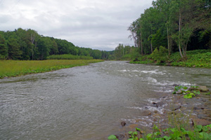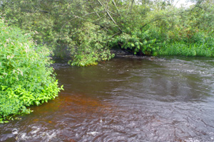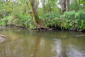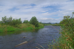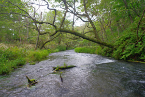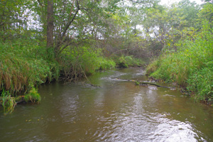 そして午後からは、いつもの別海の湧水の渓で、これまた新規のポイントを探しました。入渓した地点は、おなじみの渓ですので、なんとなく釣り方は判ると言うものです。渓を下りながら釣って行くと、まずは32cmのニジマスがヒット。その後、もう一尾のおチビちゃんを挟んで、やがて渓の大きく屈曲した深みのありそうな大場所が現れました。この渓では、釣り人の多く入るポイントでは、ほとんどルアーに反応しなくなっています。しかし、ちょっと外れた人の少ないポイントへ入れば、それほどスレておらずにルアーに良く反応してくれるだろうと考えた訳です。