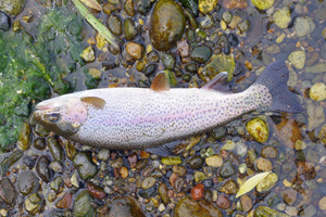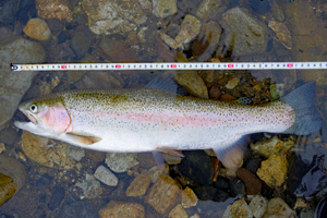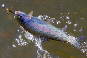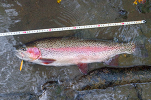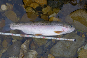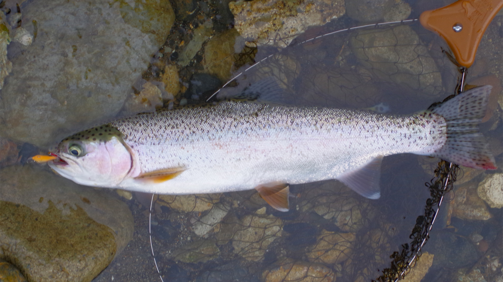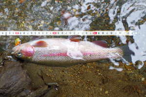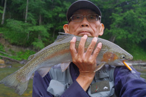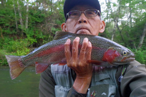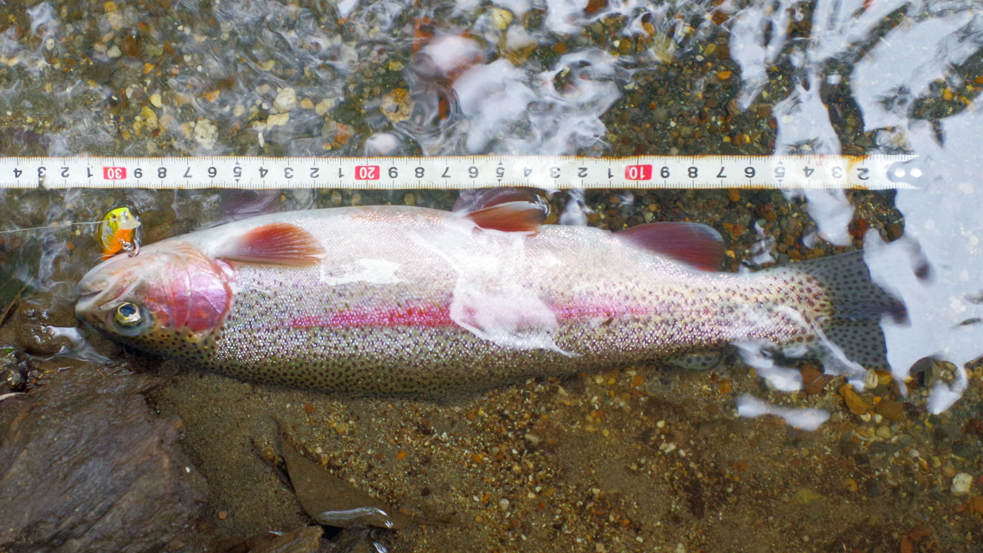 ところが11時を過ぎると、アメマスがバタバタと釣れ始め、どうやらとても遅い時合いだった様です。そして11時20分ころ、今年初めてのサクラマス38cmがヒット。大アメマスのヒットを挟んで、更に12時前でした。ラインが3色ほども引き出される強烈な魚信がありましたが、残念ながら鉤を外されアウト。鋭角的なあの強い引きは、大ニジマスだったに違いありません。アメマスと違い、大ニジマスは体を縦回転させたり、ジャンプしたりと、鉤を外すのがとても上手なのです。それでも12時20分頃になり、再びラインが大きく引き出される魚信が出て、下写真の大ニジマス51cmがヒット。こちらは無事、取り込めました。