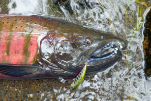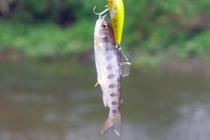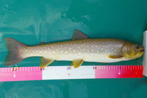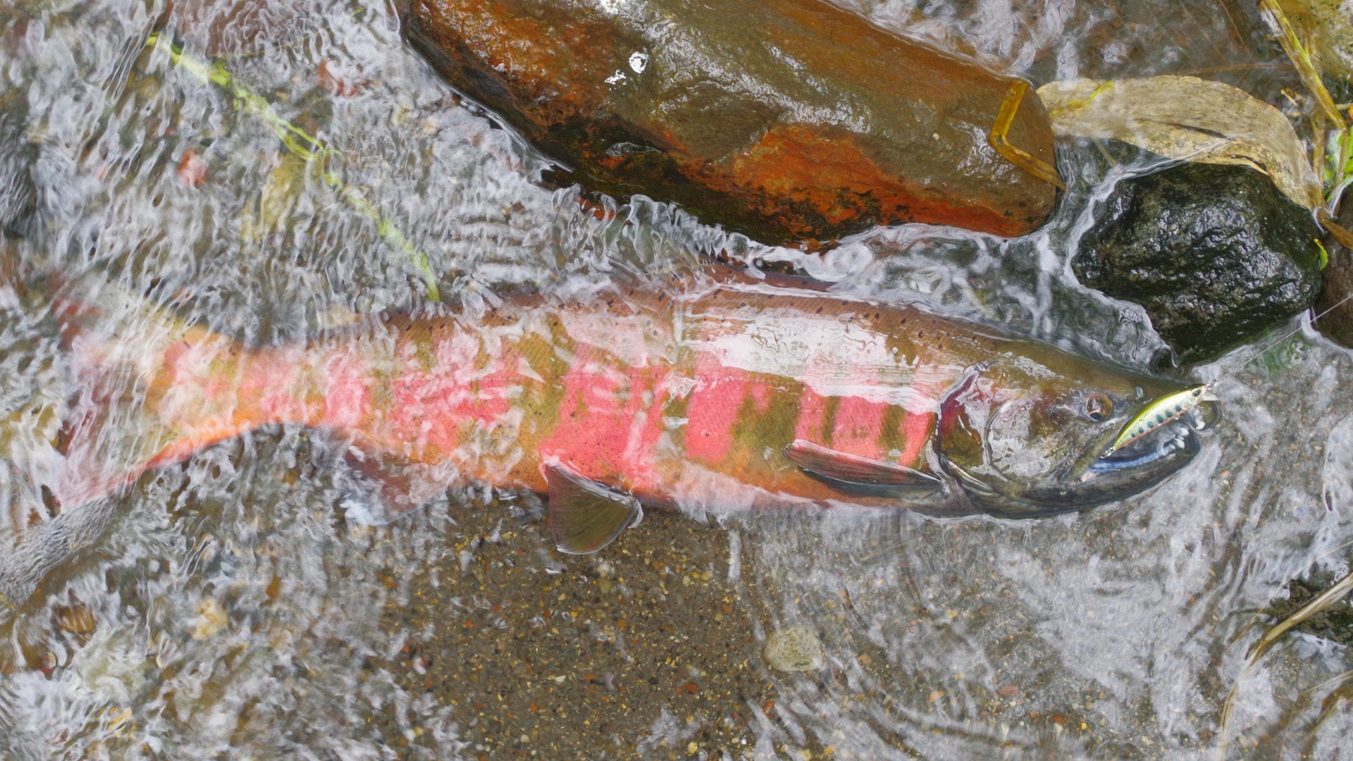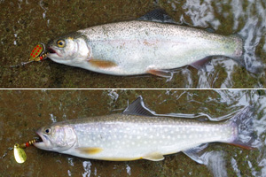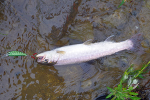 この釣り場では数年前に、半日で68尾の小イワナを釣り上げた記録がありますが、この日は2時間ほどで小さなイワナ10尾と、ブルックとヤマメが1尾づつでした。ただ、これだけサクラマスが沢山泳いでいると、どうしても釣れてしまいます。サケやカラフトと違い、サクラマスは結構な頻度でルアーに喰い付いてきます。渓流の釣り師にとっては、今や渓のとんでもない厄介者なのです。この日も大きなサクラマスがヒットし、辟易としました。サケと違い、なんら有効利用のされていないサクラを禁漁にしているのも、理由が判りません。なんとかならないものでしょうか。