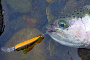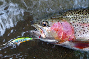 この作戦は一応成功だった様で、深みの底にSukari50ssDeepを沈めリーリングしてくると、なんと1投目で強烈な魚信が出て、上写真の大ニジマス55cmがヒット。今年9尾目の大ニジマスでした。それにしても、今年は変な年です。6月中旬に来道して以来、7月末までの1ヵ月半ほどは、大物の釣果は全く無し。ところが、8月に入ると雨に恵まれ(?)、バタバタと大物が釣れ始めました。そして、9月に入ると阿寒湖でも渓でも大ニジマスが頻発し、あっと言うまに9尾目の大ニジマスとなりました。こんな事ってあるんですねぇ・・・。