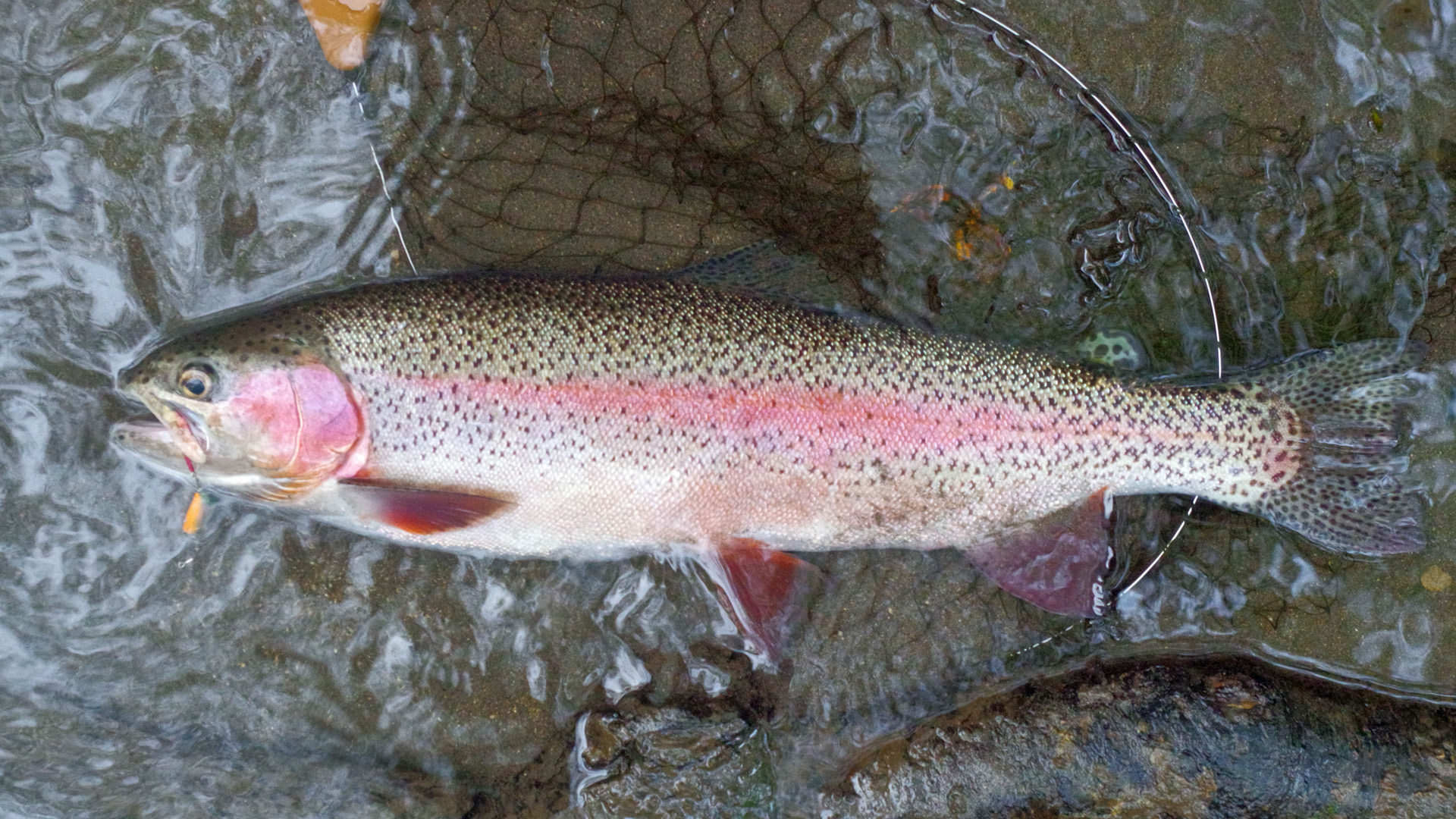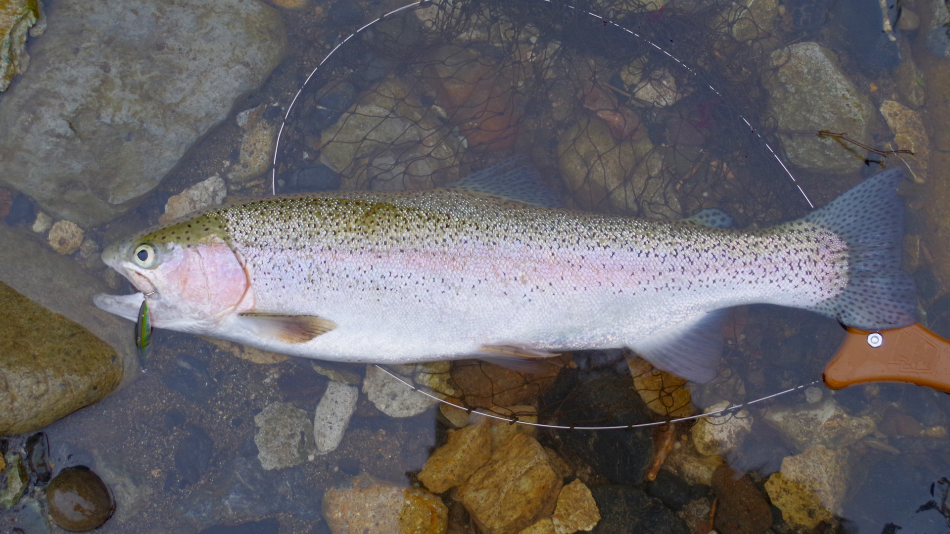 そして16時半になり、待望の強烈な魚信が出て、まずはニジマス47cmがヒット。この頃、雨が次第に強くなり、本降りに。釣りには辛いのですが、雨で水面が叩かれ、魚の警戒心が薄れます。加えて前日からの濁りで魚たちは腹ペコのハズ。そんな大物の大チャンスを逃す訳にいきません。そして、17時前になり、先ほどよりも明確に強い魚信が出て、魚が大暴れし始めました。ほんの5分ほどのやりとりでしたが、付近はなだらかな砂利浜になっていて、なんなくランディングに成功。今年の渓での最大の、55cmの大ニジマスでした。びしょ濡れでしたが、大満足でした。