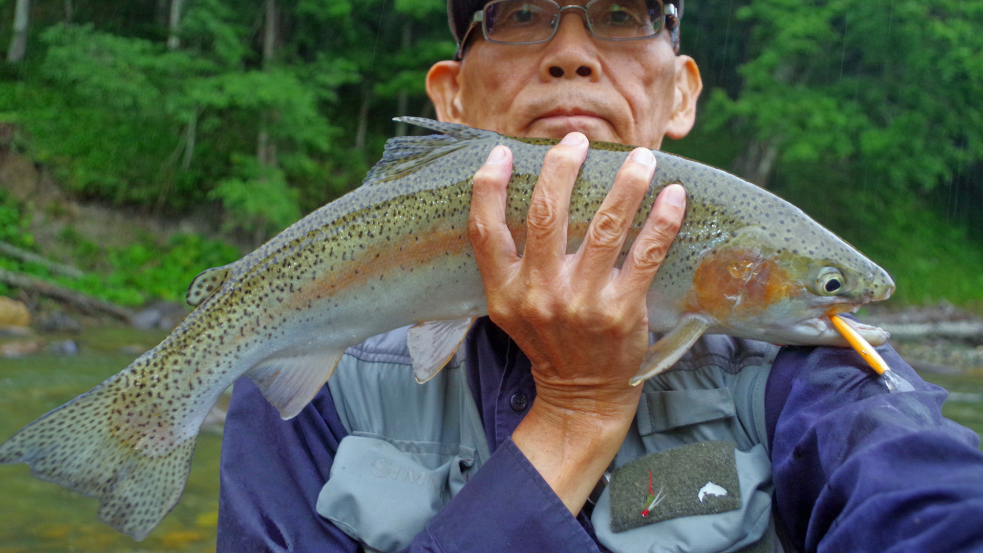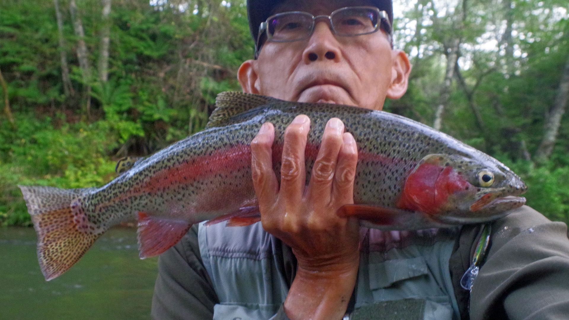 9月になりました。例年であれば秋空の広がる道東ですが、今シーズンは未だ秋雨模様のぐずついた日の多い気候となっています。既に海や河口ではアキアジ(白鮭)釣りが最盛期を迎え、今年は幾分良い釣果が見られている様です。渓流では、遡上アメマス釣りにニジマスの釣りと、様々な釣りが秋の本番を迎えつつあり、これからの1月半ほどは、秋の釣りの最も楽しく、また、忙しい時期となります。気温の変化の激しい時期でもあり、体調を崩さない様に気を付けながら、引き続き、秋の北海道を存分に堪能したいと思っています。 (下写真は、秋空に映える雄阿寒岳) ![]() ![]() 【9月2日(火)雨のホームでようやくまともな大ニジマス】 8月初から雨が続いていますが、前日1日も終日、霧雨の鬱陶しい日でゲンナリ。しかし、この日の午前は、超久しぶりに青空が見えたため、勇んで朝からホームの渓へ繰り出しました。前夜に結構な雨が降っていて、強めの濁りが出ていましたが、ルアーであれば十分に釣りになると思われました。しかし、釣り始めると、これが全く反応がありません。3ヶ所ほどポイントを移動して、なんとかおチビちゃんが3尾だけ。そういえば、地元の釣り人は全く見かけませんでしたが、一体、彼らはどうやって釣れる・釣れないを判断しているんでしょうね、不思議です。