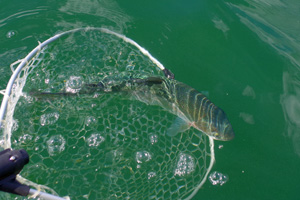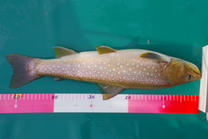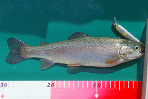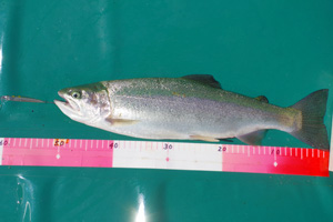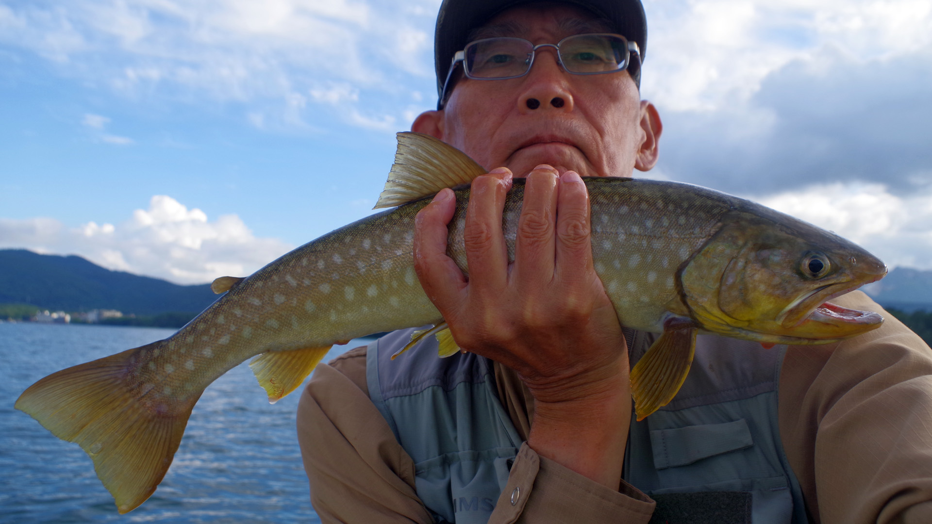 それでも、お昼頃になると良く晴れて、暖かくなってくれました。すると13時半ころに尺ニジマスがヒット。アメマスも午前中よりサイズが大きくなり、やはり10m以上の深い場所を釣るレイクトローリングは、良いお天気に限ります。そして15時頃でした、明確に鋭い魚信が出て、ボートの遥か後方で魚がジャンプ。しかし、タモ網で取り込もうとした瞬間、猛ダッシュされ、ジャンプされて鉤を外されてしまいました。敵もさるものでした。それでも、アメマスは、53、53、52cm、40cm台8尾、40cm未満5尾、計16尾、ニジマス30cm1尾と、午前中の悪天候の割には、十分に楽しめました。