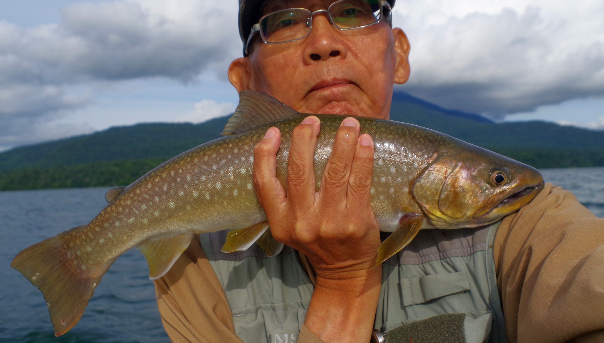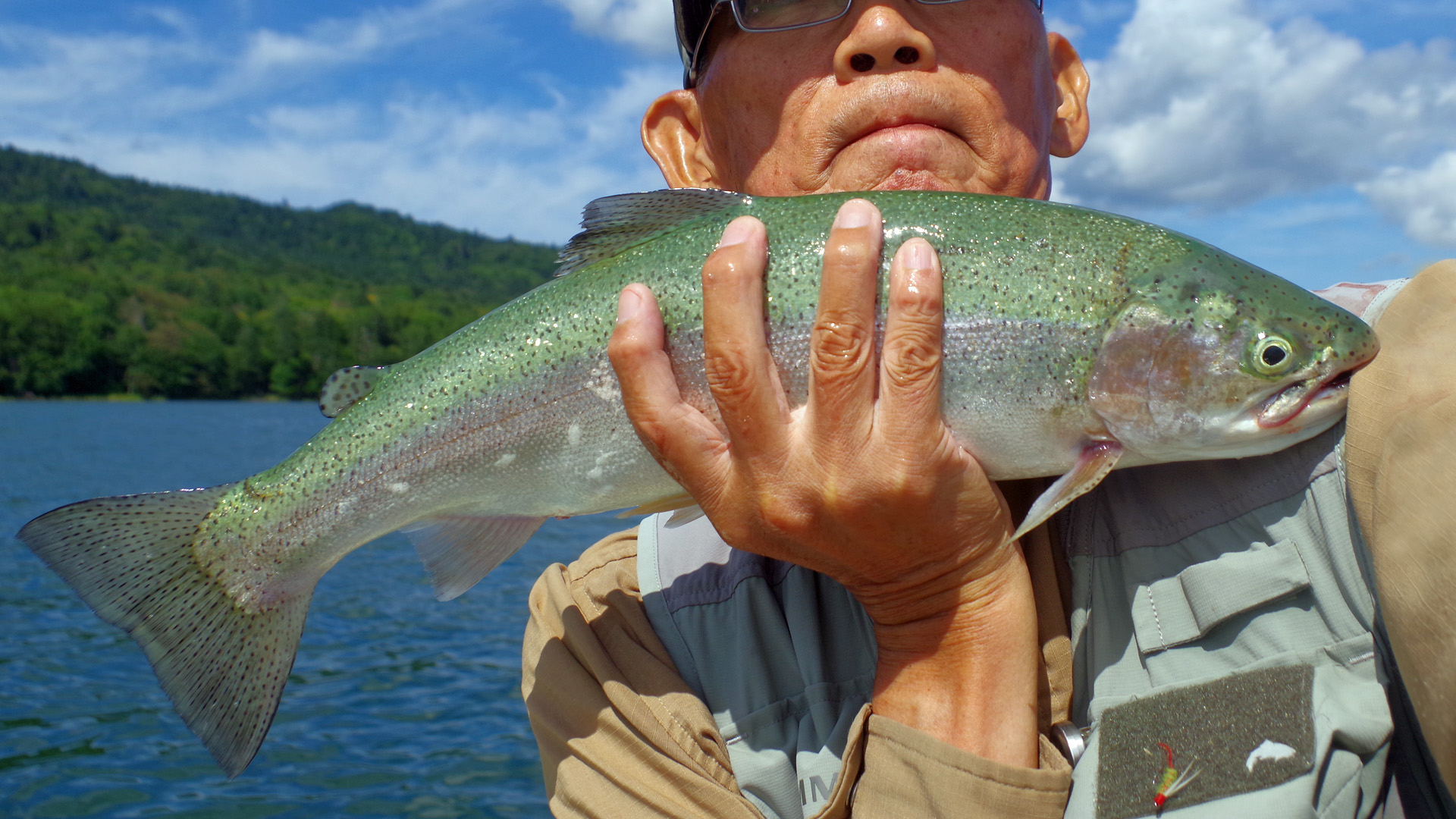 そして結局この日も、ニジマス51cm、サクラマス38cm、アメマス54、52cm、40cm台7尾、40cm未満4尾、計13尾と、いつも通りに楽しめました。思い出してみれば、今年は既に8回の阿寒湖釣行を重ねていますが、67cmや54cm、42cmのニジマスが釣れた日は、快晴に近い良いお天気のとても暖かい日でした。そういった日は、大ニジマス達がワカサギを求めて沖合で大暴れしている様です。阿寒湖では大量のワカサギが放流されているため、湖のど真ん中でワカサギの大きな群れが沢山見られます。そういった阿寒湖特有の状況が、釣り方を左右している様です。