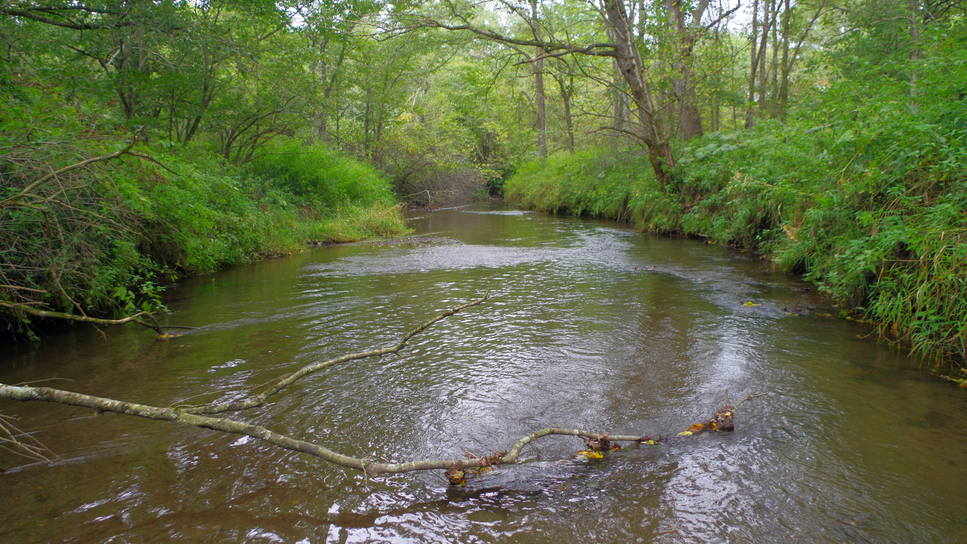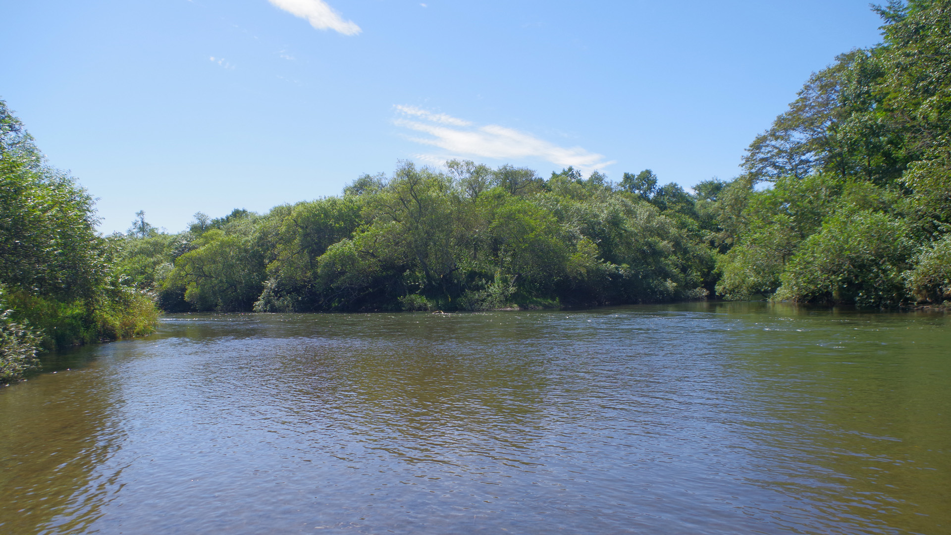 【使用タックル】 PalmsLakezeeLSZS-991/SS、StradicC3000、HardBull8+(5色/28lb/1.5号)+Nanodax20lb、自作潜行板中サイズ、 Dコンタクト63S/85S/鮎(SBL改)、Sukari60Deep/Rグリーン(SBL改)、他 【9月7日(日)2回目の別海の遡上アメマスはイマイチ】 この日は日曜のため、さぞ釣り人が多いだろうと、午前中は買い物などで過ごし、夕方15時ころから今年2回目の別海の遡上アメマスの渓へ向かいました。途中、地元の釣り人を見かけたため、お話をさせてもらいましたが、なんでも今年の遡上アメマスは相当に遅れているらしい。そういえば、前回、8月18日の釣行でも、数・型ともに最低でした。恐らく、道東沖の海水温が、平年より5℃ほど高い状態が続いているため、お魚さんたちは、未だ真夏だと思っているのでしょうね。しかも、釣り場に到着してガッカリしたのは、結構なマイナーな場所にも関わらず、真新しい釣り人の足跡だらけだった事です。