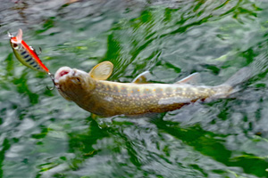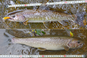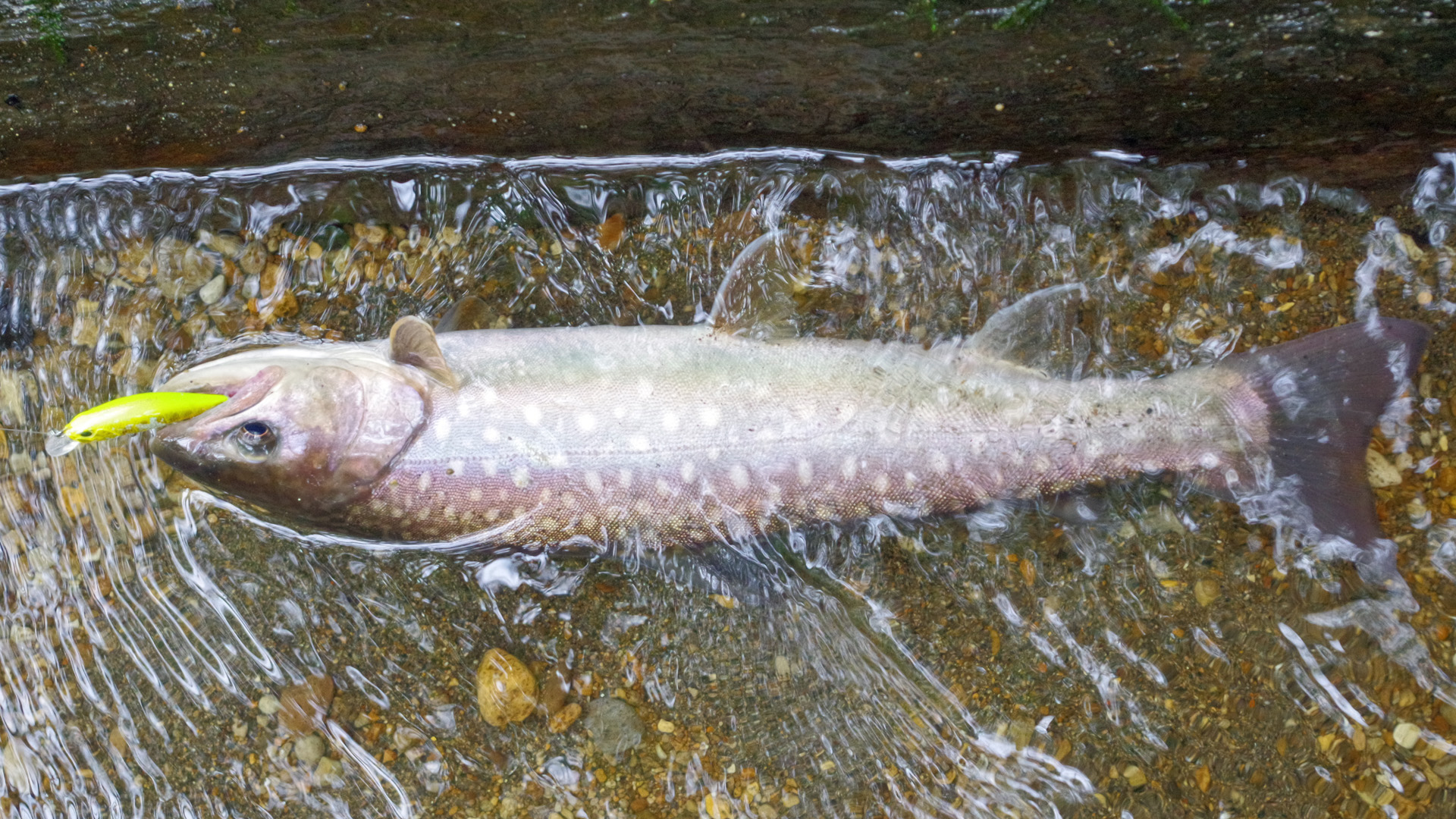 それでも構わず入渓してみると、案の定、お魚さんたちは神経質になっていて、かなり遠くからルアーを投げても反応がありません。ただ、倒木の裏側などの見過ごされそうな場所に、フリップでルアーを投入して誘うと、しっかりとお魚さんが出て来てくれました。恐らく、午前中に入った釣り人は、足跡から見て釣り上がっていた様で、大場所以外は攻めていなかった様でした。残念ながら50cmを超える様な大アメマスは出てきてくれませんでしたが、2時間半ほどで、38cm2尾を含む17尾の釣果があり、魚影は前回よりはだいぶ濃くなっている様に思えました。ただ、例年の今頃と比べると、まだまだ魚影は少なく、今後に期待と言ったところでしょうか。