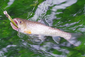 下流部でこれほど濁っているのなら、例のダム上の渓も濁りが出て良い釣りができるのでは?と、午後からは、またまたダム上を目指しました。ただ、現場に到着してガッカリしたのは、渓は薄茶色の結構な強い濁りで、釣りになりそうもありません。それでも、下流部から1時間近くもかけて移動して来たからには、黙って帰る訳にも行かず、1時間ほど昼寝をして、透明度の少しでも上がるのを待ちました。すると、16時ころになり、みるみる濁りが薄くなり、渓水が緑色を帯びてきました。チャンス到来の様です。ミノーを投げると尺までのアメマスが3尾ヒット。