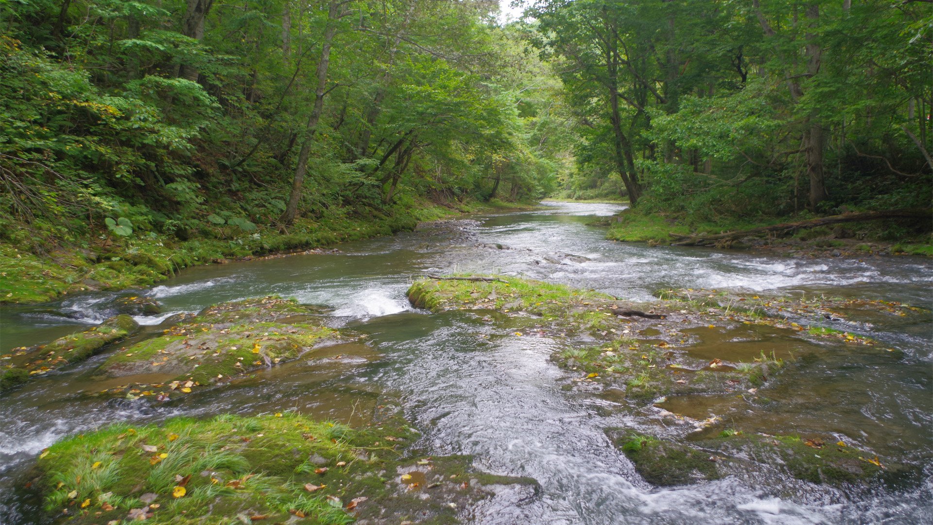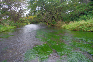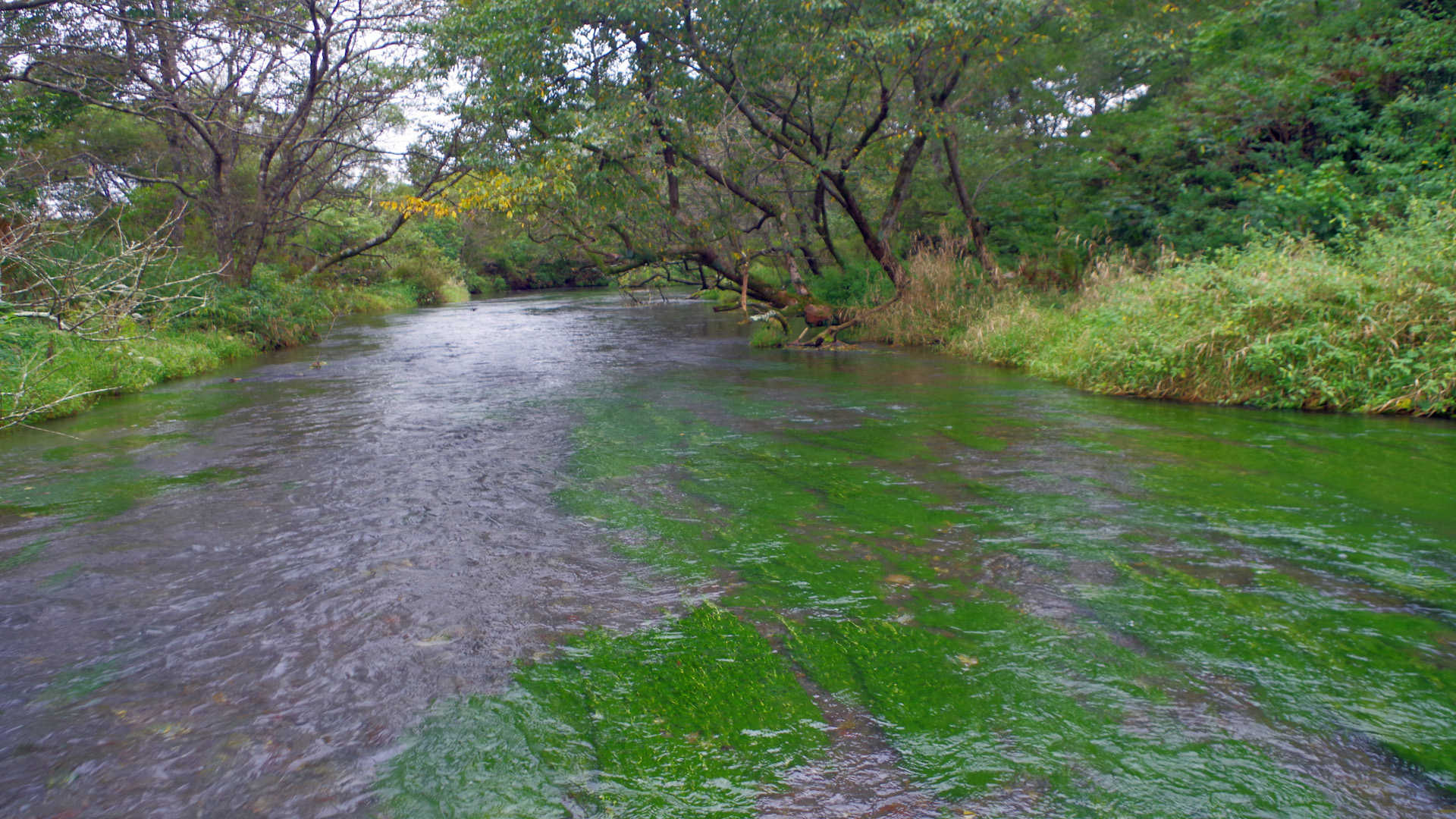 【使用タックル】 IL_Flusso/Tilf72、VanfordC3000HG、SiglonPEx8(35lb/2号)+GrandMaxFx2.5号、 Sukari50ssDeep/オイカワOB、Bretton#2/金赤(錘2号) 【9月9日(火)湧水の渓の源流部で小物釣りを楽しむ】 この日は久しぶりに、別海の湧水の渓の源流部で、小物釣りに勤しみました。十数年前まではこの時期、白鮭とカラフトマスで溢れていたのですが、年々数が少なくなり、3年ほど前から全く見かけなくなりました。代わりに増えているのがサクラマスです。今年は昨年よりも更に増えていて、昔はサケで黒く見えた淵が、今はピンク色になってしまいました。加えて、40cm超えの大型も含めて、イワナが実に沢山釣れたものですが、最近はめっきり釣れなくなっています。また、バイカモの繁茂も少なくなっています。全ては温暖化のせいなんでしょうね。