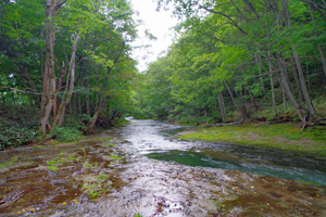 注:サクラマスを始め、全ての釣魚は写真撮影後、生きたままリリースしています。 【使用タックル】 IL_Flusso/Tilf72、VanfordC3000HG、SiglonPEx8(35lb/2号)+GrandMaxFx2.5号、 Ryuki50S/赤腹ヤマメ、Bretton#2/金赤 【9月10日(水)富良野の渓は大増水後でイマイチ】 この日は午前中に阿寒から富良野まで大移動しました。快晴の良いお天気になりそうなため、富良野・美瑛で写真撮影の予定です。ただ、お昼には富良野に到着してしまったため、時間を持て余し、近くのナメ床の綺麗な渓でチョイ釣りを楽しみました。富良野では前週に大雨が降っていて、渓は大増水した様です。未だに濁りが残っていて、ルアーには最適かと思われましたが、なぜか活性が低く、ニジマスとアメマスのおチビちゃんが2尾づつお相手をしてくれただけでした。本当は大きなブルックトラウトを釣りたいんですが、はて、最近、ちっとも釣れませんね。