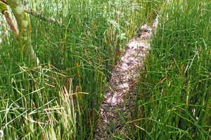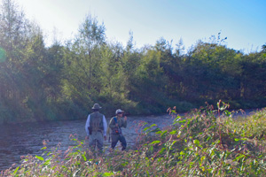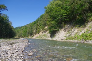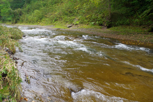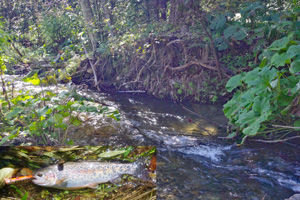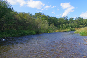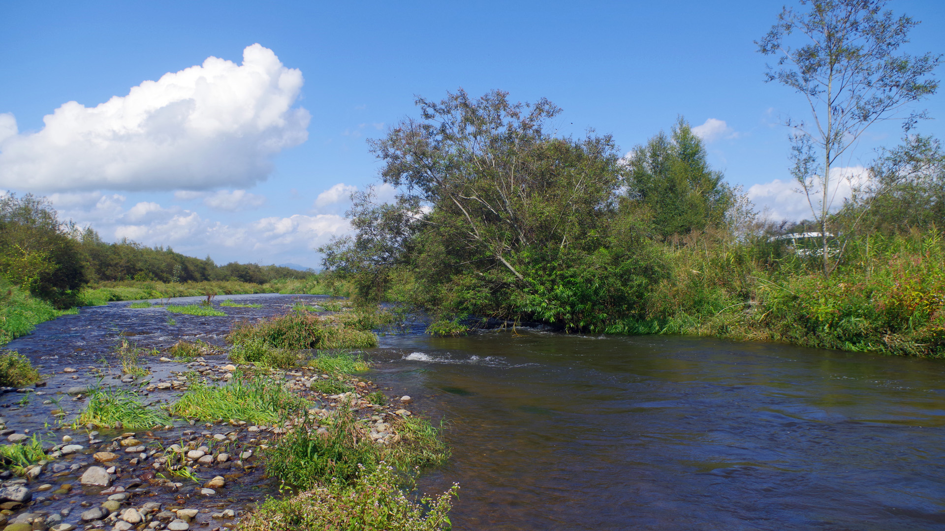 【使用タックル】 PalmsLakezeeLSZS-991/SS、StradicC3000、HardBull8+(5色/28lb/1.5号)+Nanodax20lb、自作潜行板中サイズ、 Sukari60Deep/Rグリーン(SBL改)、Dコンタクト73S/ワカサギ(SBL改)、Dコンタクト85S/鮎(SBL改)、他 【9月20日(土)釣り人避けて藪漕ぎ地獄の先に天国】 シルバーウィークも後半の連休になると、目ぼしい釣り場はどこも釣り人だらけです。こういう時は皆が嫌がって入らないポイントに逃げ込むに限ります。下左写真の渓流は、別海の湧水の渓のどこかですが、場所は明かしたくないので、同じ雰囲気の写真を張り付けました。この渓は湿原河川であり、クネクネと曲がりながら根釧原野をオホーツク海へと下ります。ただ、周囲は暗い木立に囲まれていて、釣り人が頻繁に入る場所は、実は限られています。殆どがイラクサとトクサの生い茂る、地獄の様な藪を通り抜けないと、渓に立てないのです。