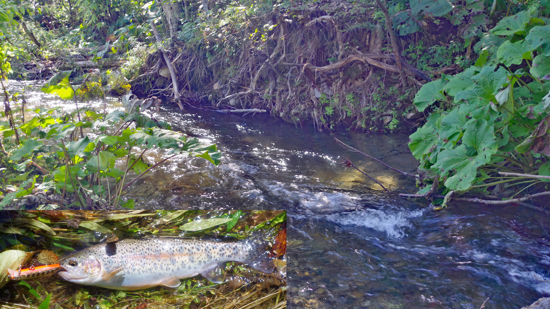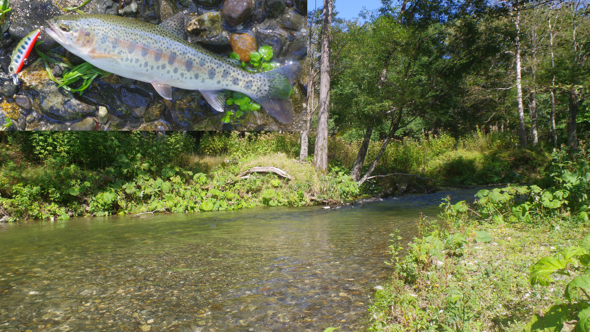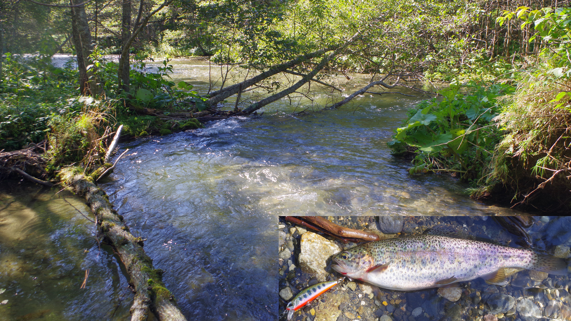 【使用タックル】 ありません。 【9月13日(土)釣り人だらけの渓でブルックトラウト】 この日は朝から暗い曇天のため、写真撮影は諦め、お昼頃から2時間ほどだけ、富良野のブルックの釣れる渓へ出陣しました。土曜とあって、予想通りに釣り人だらけですが、空いている所にとりあえず入渓。ただ、いくらルアーを投げても全く反応がありません。どうやら先行者が、荒らしまくった後の様でした。仕方なく、今度は入渓しづらくて釣り人が嫌うポイントを選び、入渓。すると、すぐに反応が出て、小さなニジマスがヒット。この付近はナメ床になっていて、幅50〜2mほどで深さが数十cm〜数mのトイが沢山できています。そのトイの中に魚が付いています。