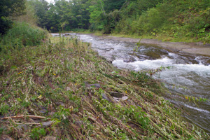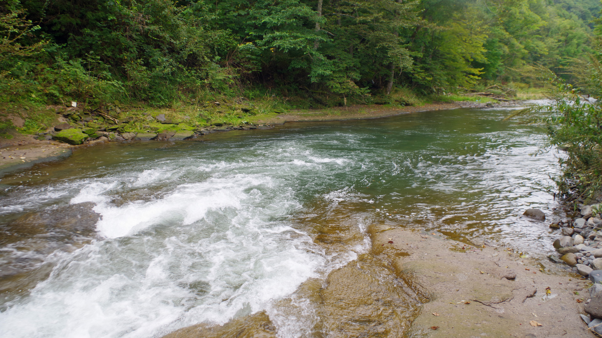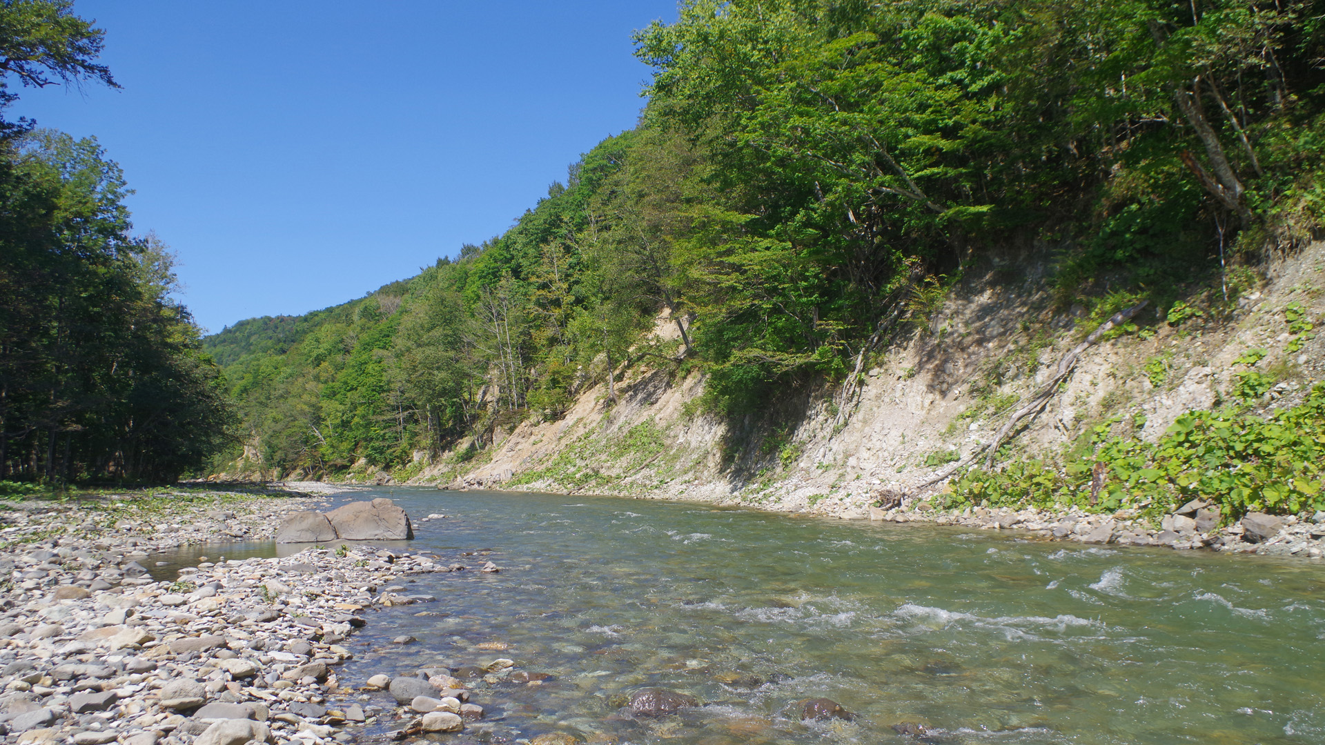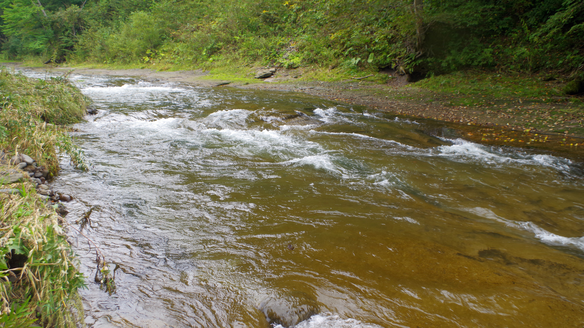 【使用タックル】 ありません。 【9月13日(土)釣り人だらけの渓でブルックトラウト】 この日は朝から暗い曇天のため、写真撮影は諦め、お昼頃から2時間ほどだけ、富良野のブルックの釣れる渓へ出陣しました。土曜とあって、予想通りに釣り人だらけですが、空いている所にとりあえず入渓。ただ、いくらルアーを投げても全く反応がありません。どうやら先行者が、荒らしまくった後の様でした。仕方なく、今度は入渓しづらくて釣り人が嫌うポイントを選び、入渓。すると、すぐに反応が出て、小さなニジマスがヒット。この付近はナメ床になっていて、幅50〜2mほどで深さが数十cm〜数mのトイが沢山できています。そのトイの中に魚が付いています。