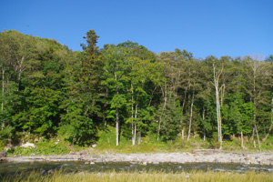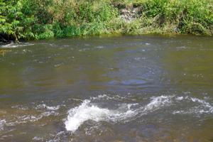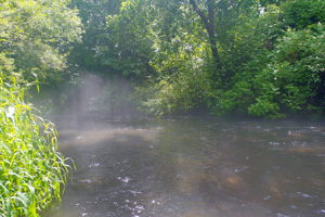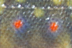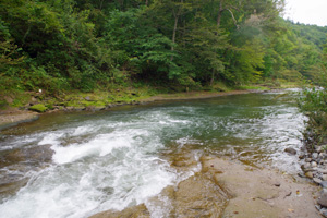 そして、しばらく釣り下がると、写真上右の、少し大きめの淵が見えてきました。前週の2日にこの地区では50mmを超える豪雨が有り、そのせいか、未だに青白い笹濁りの状態が続いていました。深い淵の底に定位している魚からは、こちらの姿は見えていない筈であり、ルアーには良い条件の様に思えました。しかし、相当にスレているのか、25cmほどのブルックトラウトとニジマス35cmが釣れただけでした。でもま、最近はこの渓でちっともブルックが釣れていなかったため、久しぶりに青いリングのある赤い斑点を見る事ができて、ラッキーでした。