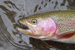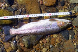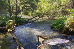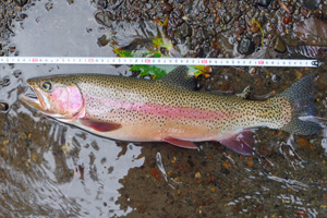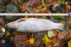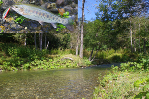 そして、何度も釣り場に通っていると、そんな独り占めの釣り場を幾つか開拓できます。この日もそんな釣り場の一つへ入りましたが、渓に立つまではイラクサの生い茂る地獄を通り抜けなければいけません。ただ、湧水の渓は、夏でも水温が低く、冬も結氷しないため、渓魚の成長が早く、大物の宝庫となっています。地獄を通り抜けると天国が待っています。そして、渓の屈曲部の深みにミノーを投入し、十分に沈めてからやおらリーリングしてくると、すぐにガツンと魚信が出て、大ニジマスが暴れ始めました。正に天国でした。今年10尾目の大ニジマス53cmでした。