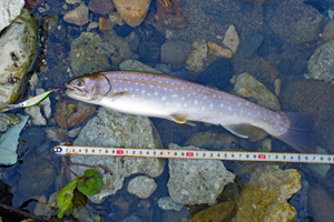 こんなに濁っているのなら、源流部でも良い濁りで大物が期待できるかもと思い、またまた例によってダム上の渓を目指しました。しかしながら、現地に到着してガッカリしたのは、こちらは逆に全くのジンクリアだったこと。一体どうなってるんでしょうね。それでも折角来たからには釣らずに帰る訳にも行きません。釣り始めると、こちらでは型の良いアメマス君がお相手をしてくれ、なんとか釣果を見ることができました。ただ、こちらでもニジマスの反応は皆無で、んーーー、ニジマスというお魚さんの気持ちが、未だにサッパリ判りません。不思議。