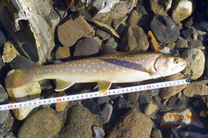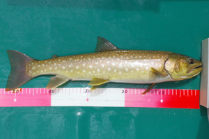 午後は同渓の最源流部に、久しぶりに入ってみました。10年以上前、この付近では、小さなミノーを投げるとオショロコマがぞろぞろと10尾ほども追い掛けてきました。しかし、5年ほど前にニジマスが釣れ始め、代わりにオショロが激減し始めました。そしてこの日は、1時間ほどの釣りで、小さなニジマスが3尾だけ。オショロの姿は遂に全く見られなくなってしまいました。恐らく、更に源流部のニジマスの入れない細い流れに、オショロ達は健在なのではないかとは思いますが、寂しい限りです。